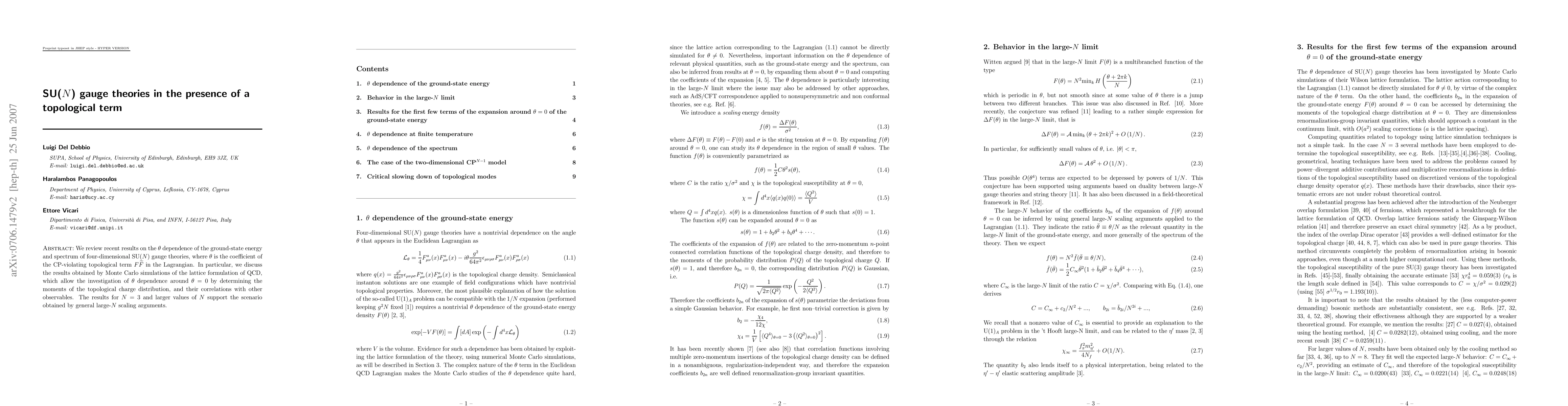 This paper reviews recent findings on the theta dependence in four-dimensional SU(N) gauge theories, focusing on the CP-violating topological term. Monte Carlo simulations of lattice QCD reveal theta's impact on the ground-state energy and spectrum, supporting large-N scaling arguments for N=3 and higher.