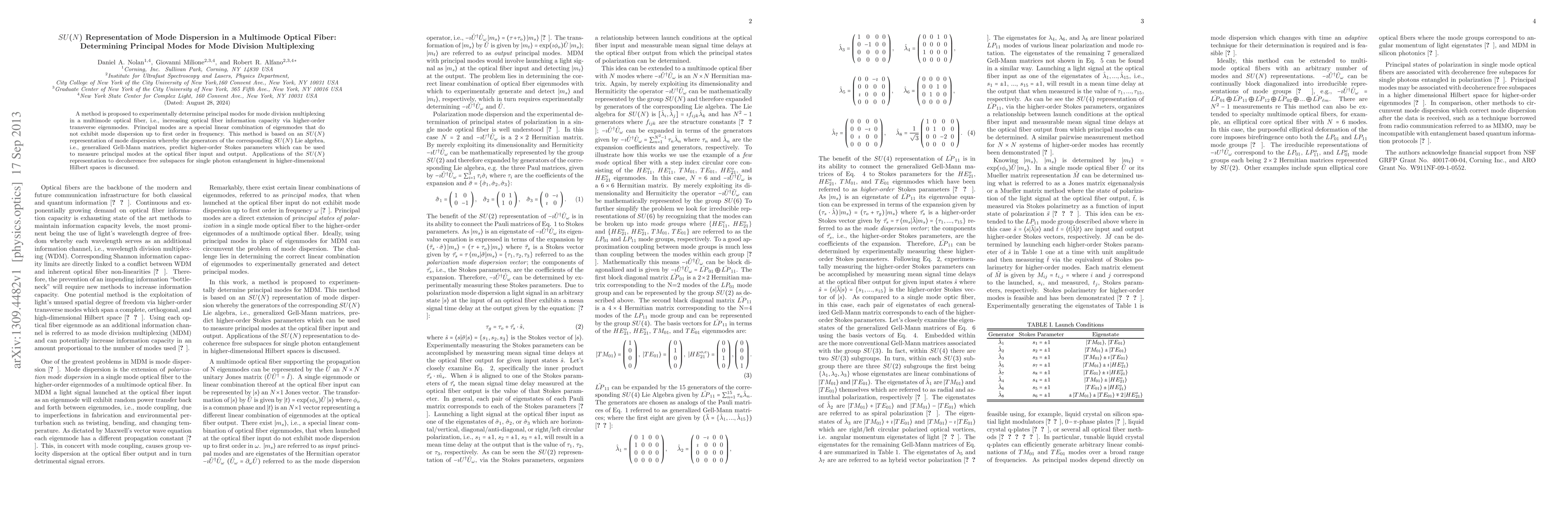 A method is proposed to experimentally determine principal modes for mode division multiplexing in a multimode optical fiber, i.e., increasing optical fiber information capacity via higher-order transverse eigenmodes. Principal modes are a special linear combination of eigenmodes that do not exhibit mode dispersion up to first order in frequency. This method is based on an SU(N) representation of mode dispersion whereby the generators of the corresponding SU(N) Lie algebra, i.e., generalized Gell-Mann matrices, predict higher-order Stokes parameters which can be used to measure principal modes at the optical fiber input and output. Applications of the SU(N) representation to decoherence free subspaces for single photon entanglement in higher-dimensional Hilbert spaces is discussed.
