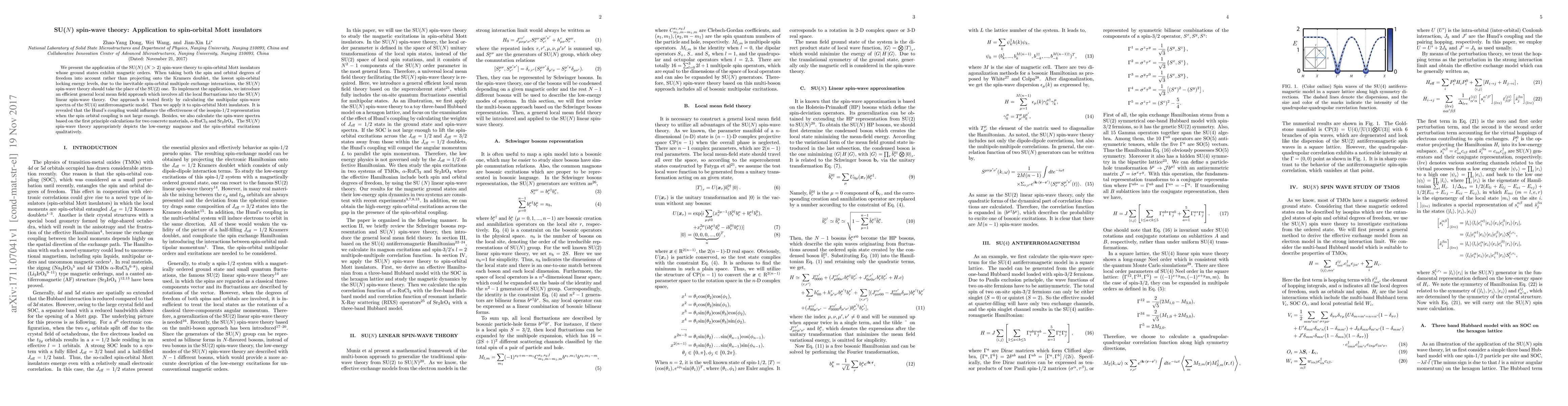 This paper applies SU($N$) spin-wave theory to spin-orbital Mott insulators, emphasizing the importance of considering both spin and orbital degrees of freedom. The study introduces a local mean field approach to implement this theory and demonstrates its effectiveness through calculations on SU($4$) models and real materials like $\alpha$-RuCl$_3$ and Sr$_2$IrO$_4$, showing that Hund's coupling impacts the isospin representation when spin-orbital coupling is not strong.