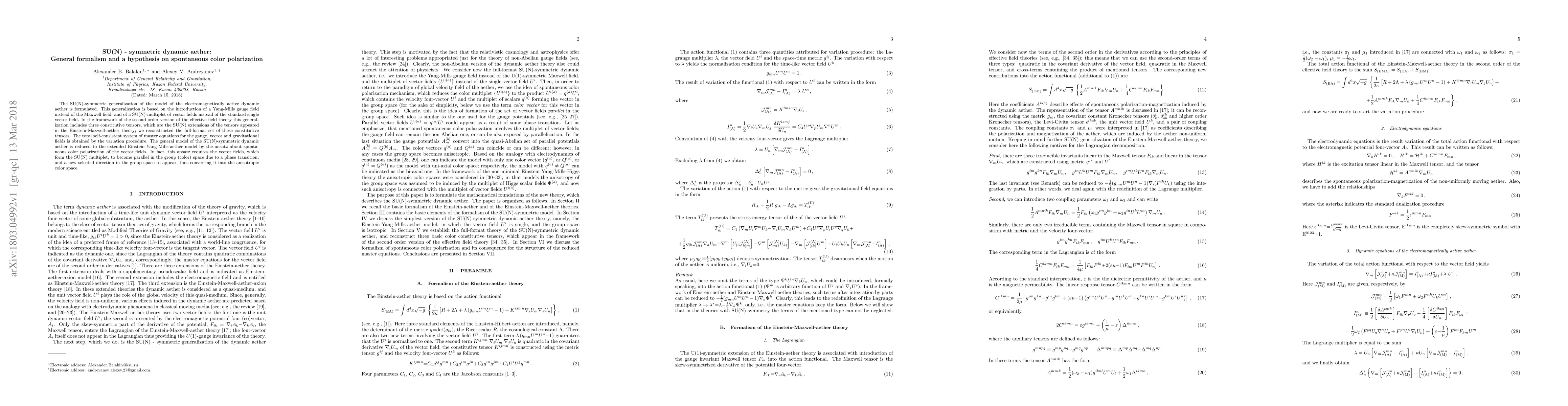 The SU(N)-symmetric generalization of the model of the electromagnetically active dynamic aether is formulated. This generalization is based on the introduction of a Yang-Mills gauge field instead of the Maxwell field, and of a SU(N)-multiplet of vector fields instead of the standard single vector field. In the framework of the second order version of the effective field theory this generalization includes three constitutive tensors, which are the SU(N) extensions of the tensors appeared in the Einstein-Maxwell-aether theory; we reconstructed the full-format set of these constitutive tensors. The total self-consistent system of master equations for the gauge, vector and gravitational fields is obtained by the variation procedure. The general model of the SU(N)-symmetric dynamic aether is reduced to the extended Einstein-Yang-Mills-aether model by the ansatz about spontaneous color polarization of the vector fields. In fact, this ansatz requires the vector fields, which form the SU(N) multiplet, to become parallel in the group (color) space due to a phase transition, and a new selected direction in the group space to appear, thus converting it into the anisotropic color space.