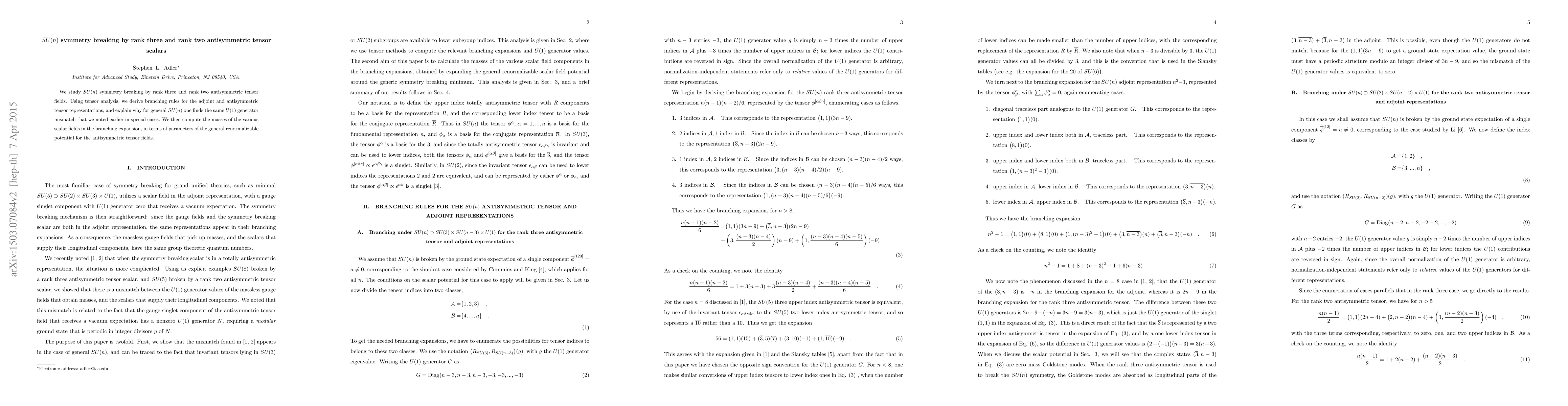 This paper explores $SU(n)$ symmetry breaking through rank three and rank two antisymmetric tensor fields, deriving branching rules and explaining the $U(1)$ generator mismatch. It also computes the masses of scalar fields from the general renormalizable potential for these tensor fields.