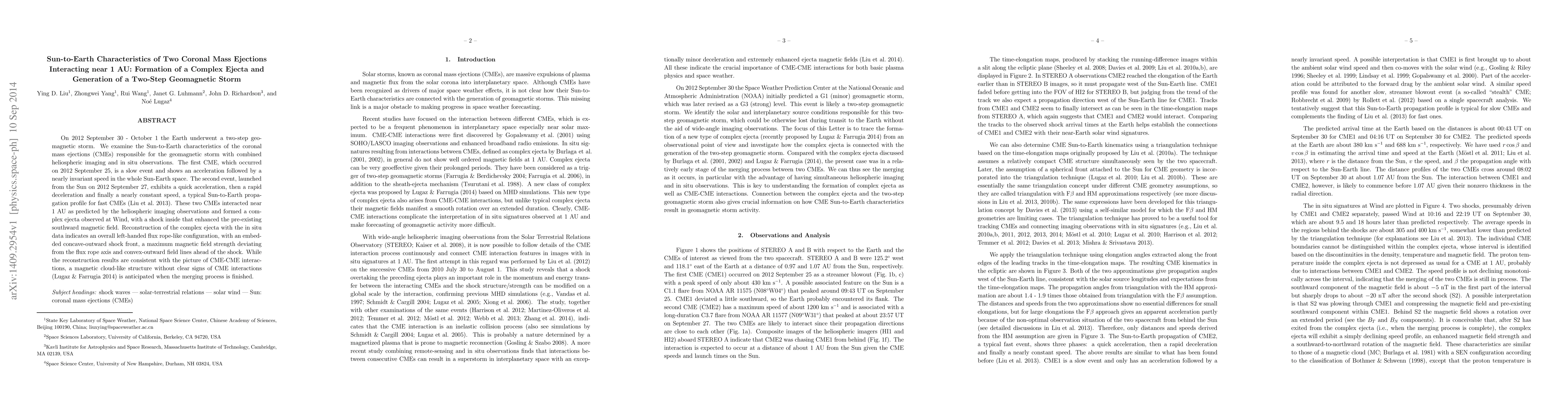 This paper investigates the Sun-to-Earth characteristics of two coronal mass ejections (CMEs) that interacted near 1 AU, resulting in a complex ejecta and a two-step geomagnetic storm. The first slow CME accelerated and then maintained a steady speed, while the second fast CME rapidly decelerated before stabilizing, leading to a complex ejecta formation and a geomagnetic storm with two distinct phases.