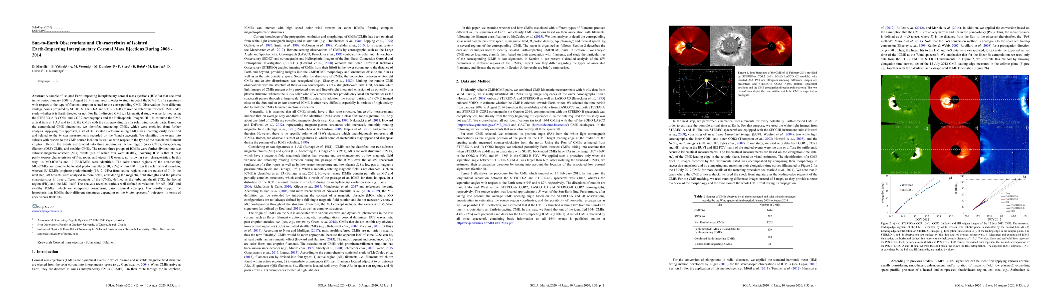 A sample of isolated Earth-impacting ICMEs that occurred in the period January 2008 to August 2014 is analysed in order to study in detail the ICME in situ signatures with respect to the type of filament eruption related to the corresponding CME. For Earth-directed CMEs, a kinematical study was performed using the STEREO-A, B COR1 and COR2 coronagraphs and the Heliospheric Imagers HI1. Based on the extrapolated CME kinematics, we identified interacting CMEs, which were excluded from further analysis. Applying this approach, a set of 31 isolated Earth-impacting CMEs was unambiguously identified and related to the in situ measurements recorded by the Wind spacecraft. We classified the events into subsets with respect to the CME source location as well as with respect to the type of the associated filament eruption. Hence, the events are divided into three subsamples: active region (AR) CMEs, disappearing filament (DSF) CMEs, and stealthy CMEs. The related three groups of ICMEs were further divided into two subsets: magnetic obstacle (MO) events (out of which four were stealthy), covering ICMEs that at least partly expose characteristics of flux ropes, and ejecta (EJ) events, not showing such characteristics. In the next step, MO-events were analysed in more detail, considering the magnetic field strengths and the plasma characteristics in three different segments of the ICMEs, defined as the turbulent sheath (TS), the frontal region (FR), and the MO itself. The analysis revealed various well-defined correlations for AR, DSF, and stealthy ICMEs, which we interpreted considering basic physical concepts. Our results support the hypothesis that ICMEs show different signatures depending on the in situ spacecraft trajectory, in terms of apex versus flank hits.