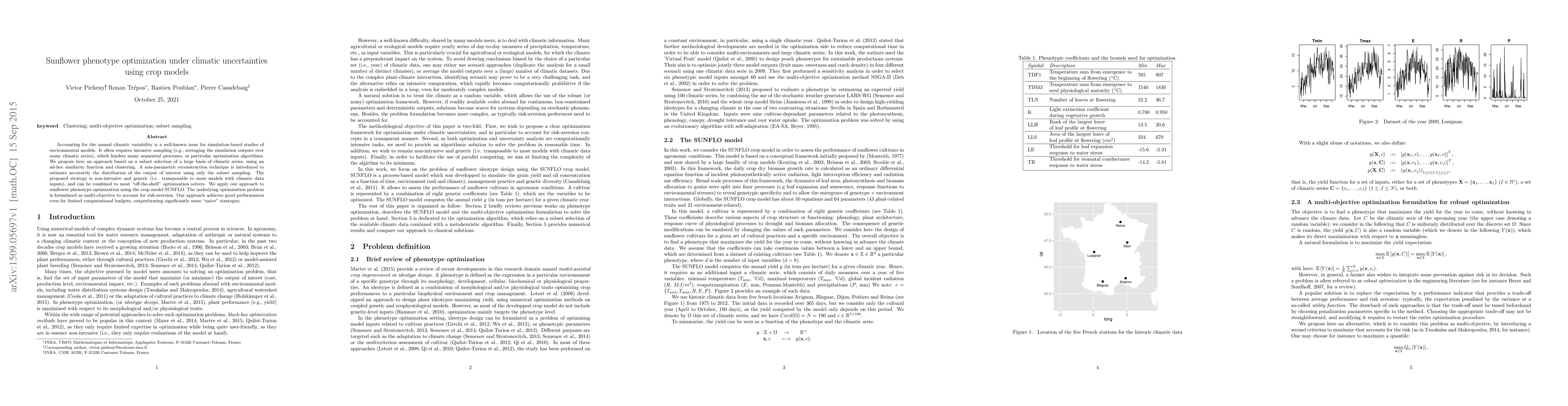 Accounting for the annual climatic variability is a well-known issue for simulation-based studies of environmental models. It often requires intensive sampling (e.g., averaging the simulation outputs over many climatic series), which hinders many sequential processes, in particular optimization algorithms. We propose here an approach based on a subset selection of a large basis of climatic series, using an ad-hoc similarity function and clustering. A non-parametric reconstruction technique is introduced to estimate accurately the distribution of the output of interest using only the subset sampling. The proposed strategy is non-intrusive and generic (i.e. transposable to most models with climatic data inputs), and can be combined to most "off-the-shelf" optimization solvers. We apply our approach to sunflower phenotype optimization using the crop model SUNFLO. The underlying optimization problem is formulated as multi-objective to account for risk-aversion. Our approach achieves good performances even for limited computational budgets, outperforming significantly more "naive" strategies.