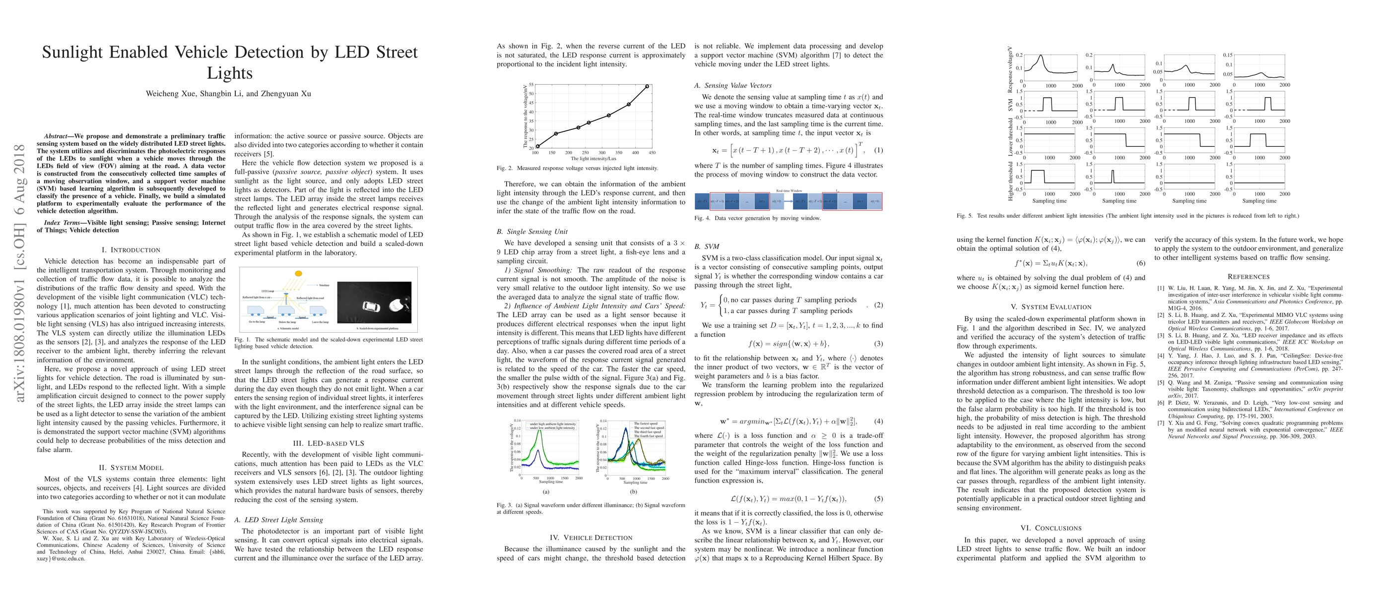 This paper proposes a traffic sensing system using LED street lights that detects vehicles by analyzing the photoelectric responses of LEDs to sunlight when a vehicle passes through. A support vector machine (SVM) classifies vehicle presence based on a data vector constructed from time samples.
