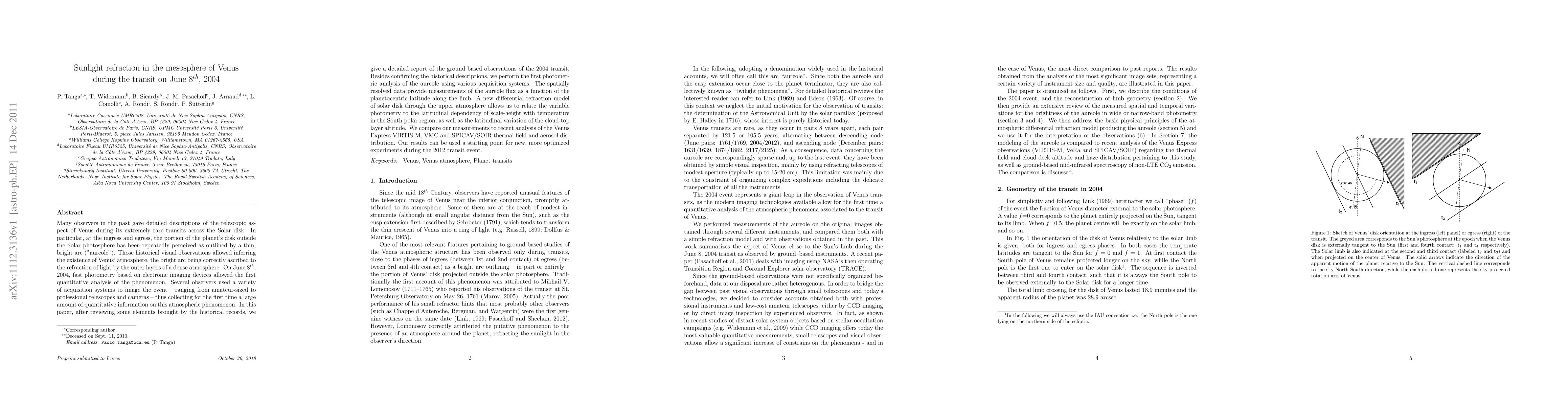 Scientists analyzed sunlight refraction in Venus' mesosphere during a 2004 transit, confirming historical observations and measuring the auroral arc's brightness as it moved around the planet.