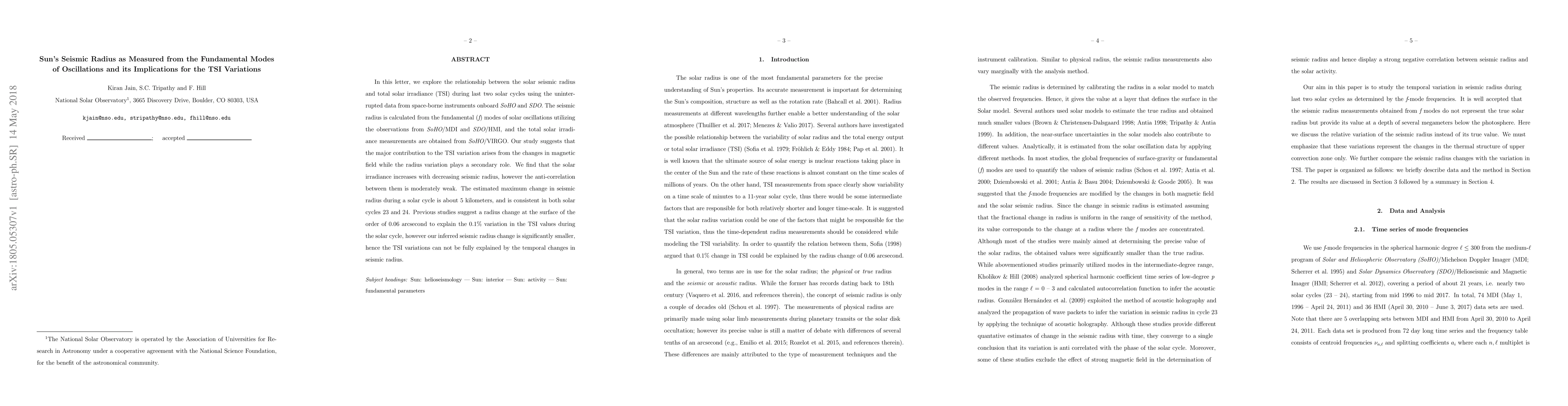 This paper investigates the correlation between the solar seismic radius derived from fundamental oscillation modes and total solar irradiance (TSI) over the last two solar cycles. It finds that while TSI variations are primarily driven by magnetic field changes, the seismic radius exhibits a smaller, secondary role, with a maximum change of 5 kilometers per solar cycle, suggesting that TSI variations cannot be fully explained by temporal changes in the seismic radius.