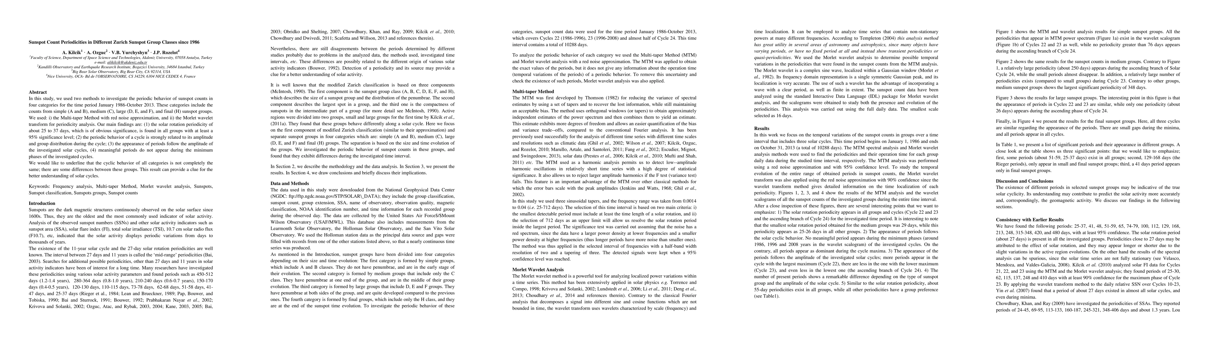 In this study, we used two methods to investigate the periodic behavior of sunspot counts in four categories for the time period January 1986-October 2013. These categories include the counts from simple (A and B), medium (C), large (D, E, and F), and final (H) sunspot groups. We used: i) the Multi-taper Method with red noise approximation, and ii) the Morlet wavelet transform for periodicity analysis. Our main findings are: (1) the solar rotation periodicity of about 25 to 37 days, which is of obvious significance, is found in all groups with at least a 95% significance level; (2) the periodic behavior of a cycle is strongly related to its amplitude and group distribution during the cycle; (3) the appearance of periods follow the amplitude of the investigated solar cycles, (4) meaningful periods do not appear during the minimum phases of the investigated cycles. We would like to underline that the cyclic behavior of all categories is not completely the same; there are some differences between these groups. This result can provide a clue for the better understanding of solar cycles.
