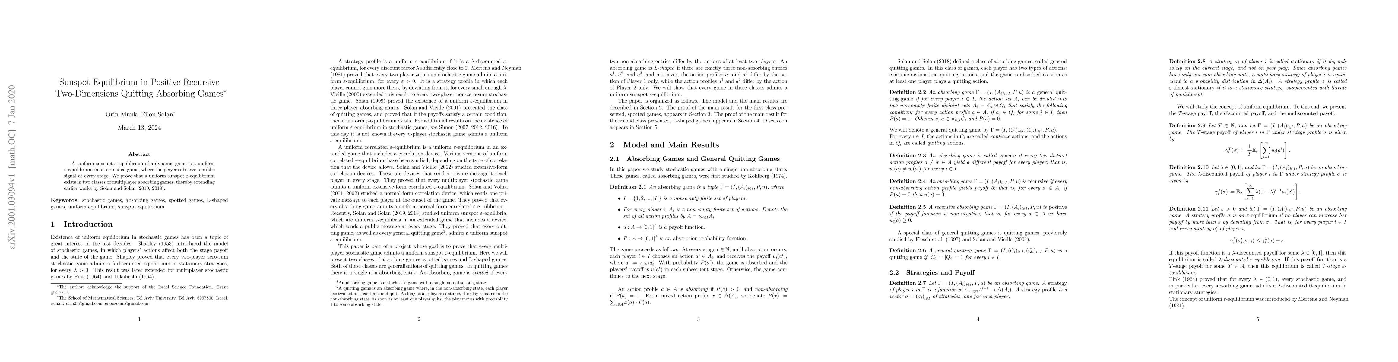 This paper proves the existence of a uniform sunspot epsilon-equilibrium in two classes of multiplayer absorbing games, extending earlier work on dynamic game theory.