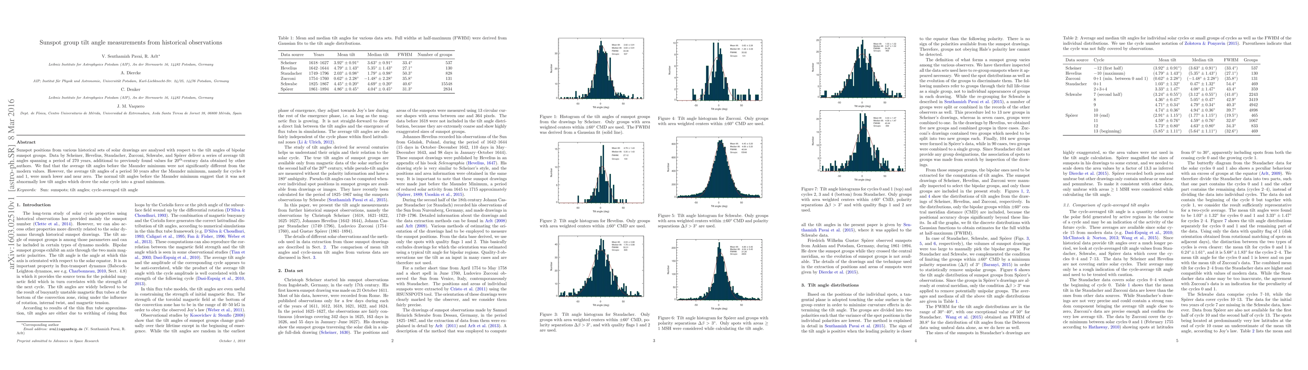 Sunspot positions from various historical sets of solar drawings are analysed with respect to the tilt angles of bipolar sunspot groups. Data by Scheiner, Hevelius, Staudacher, Zucconi, Schwabe, and Spoerer deliver a series of average tilt angles spanning a period of 270 years, additional to previously found values for 20th-century data obtained by other authors. We find that the average tilt angles before the Maunder minimum were not significantly different from the modern values. However, the average tilt angles of a period 50 years after the Maunder minimum, namely for cycles 0 and 1, were much lower and near zero. The normal tilt angles before the Maunder minimum suggest that it was not abnormally low tilt angles which drove the solar cycle into a grand minimum.