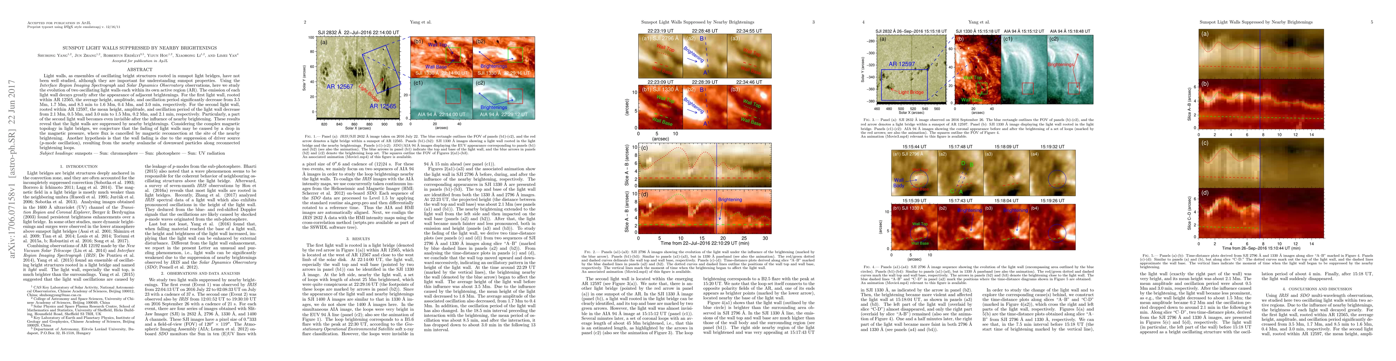 Light walls, as ensembles of oscillating bright structures rooted in sunspot light bridges, have not been well studied, although they are important for understanding sunspot properties. Using the Interface Region Imaging Spectrograph and Solar Dynamics Observatory observations, here we study the evolution of two oscillating light walls each within its own active region (AR). The emission of each light wall decays greatly after the appearance of adjacent brightenings. For the first light wall, rooted within AR 12565, the average height, amplitude, and oscillation period significantly decrease from 3.5 Mm, 1.7 Mm, and 8.5 min to 1.6 Mm, 0.4 Mm, and 3.0 min, respectively. For the second light wall, rooted within AR 12597, the mean height, amplitude, and oscillation period of the light wall decrease from 2.1 Mm, 0.5 Mm, and 3.0 min to 1.5 Mm, 0.2 Mm, and 2.1 min, respectively. Particularly, a part of the second light wall becomes even invisible after the influence of nearby brightening. These results reveal that the light walls are suppressed by nearby brightenings. Considering the complex magnetic topology in light bridges, we conjecture that the fading of light walls may be caused by a drop in the magnetic pressure, where flux is cancelled by magnetic reconnection at the site of the nearby brightening. Another hypothesis is that the wall fading is due to the suppression of driver source (p-mode oscillation), resulting from the nearby avalanche of downward particles along reconnected brightening loops.
