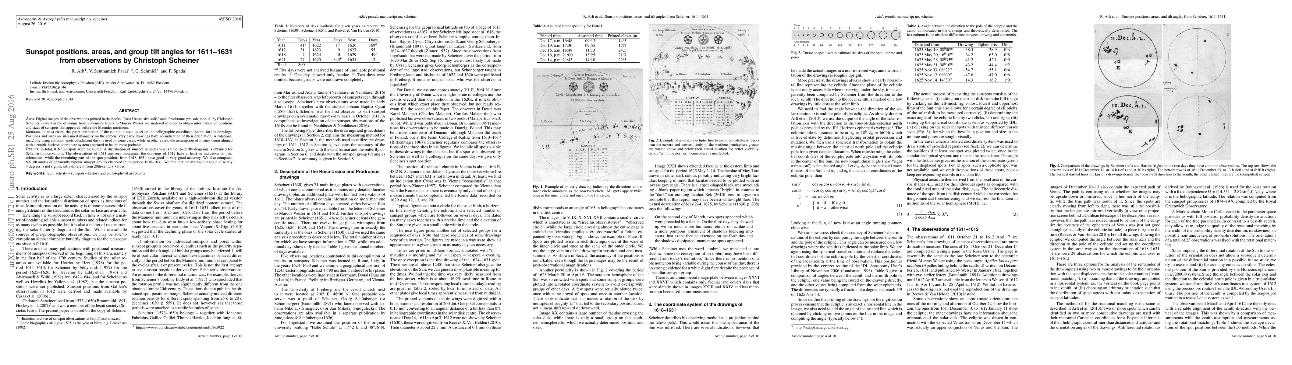 This paper analyzes digital images from Christoph Scheiner's observations to determine sunspot positions, areas, and group tilt angles from 1611-1631. The study measures 8167 sunspots and computes 697 tilt angles, finding an average tilt of nearly 4 degrees, comparable to 20th-century values.