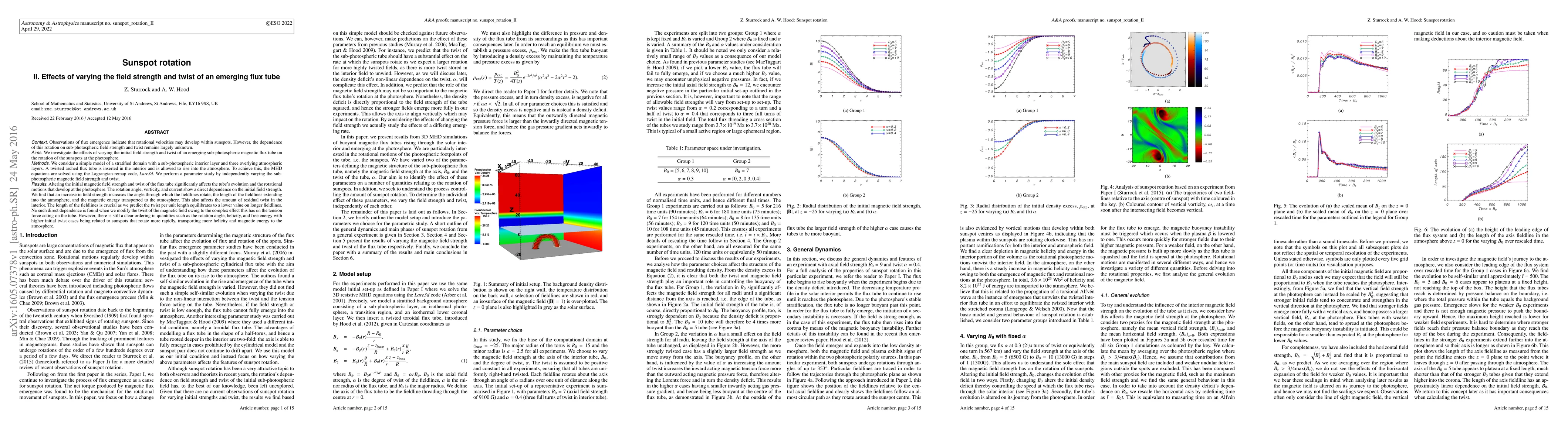 Context. Observations of flux emergence indicate that rotational velocities may develop within sunspots. However, the dependence of this rotation on sub-photospheric field strength and twist remains largely unknown. Aims. We investigate the effects of varying the initial field strength and twist of an emerging sub-photospheric magnetic flux tube on the rotation of the sunspots at the photosphere. Methods. We consider a simple model of a stratified domain with a sub-photospheric interior layer and three overlying atmospheric layers. A twisted arched flux tube is inserted in the interior and is allowed to rise into the atmosphere. To achieve this, the MHD equations are solved using the Lagrangian-remap code, Lare3d. We perform a parameter study by independently varying the sub-photospheric magnetic field strength and twist. Results. Altering the initial field strength and twist significantly affects the tube's evolution and the rotational motions that develop at the photosphere. The rotation angle, vorticity, and current show a direct dependence on the initial field strength. We find that an increase in field strength increases the angle through which the fieldlines rotate, the length of fieldlines extending into the atmosphere, and the magnetic energy transported to the atmosphere. This also affects the amount of residual twist in the interior. The length of the fieldlines is crucial as we predict the twist per unit length equilibrates to a lower value on longer fieldlines. No such direct dependence is found when we modify the twist owing to the complex effect this has on the tension force acting on the tube. However, there is still a clear ordering in quantities such as the rotation angle, helicity, and free energy with higher initial twist cases being related to sunspots that rotate more rapidly, transporting more helicity and magnetic energy to the atmosphere.