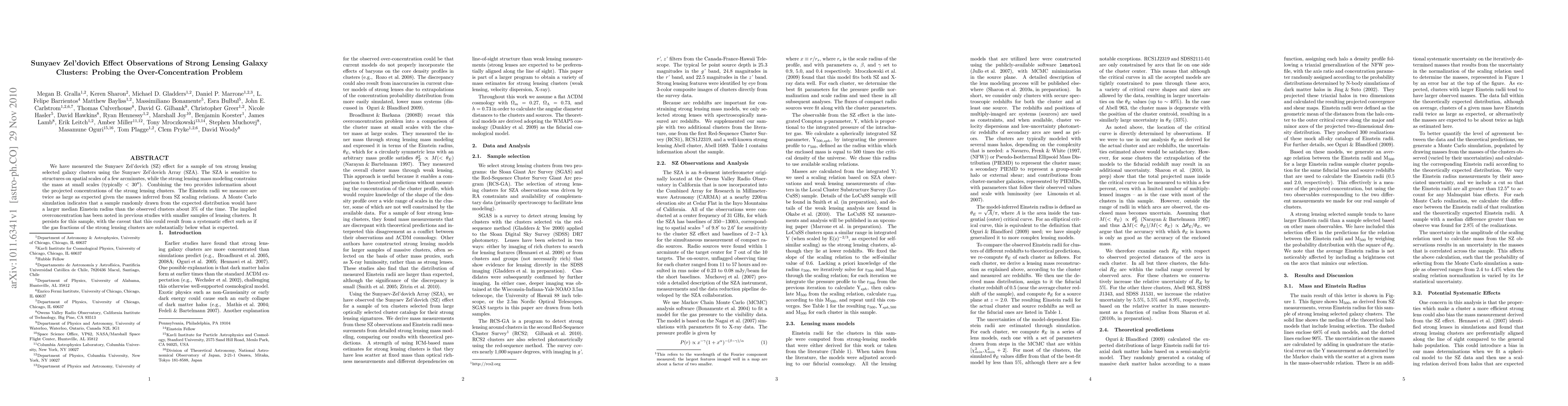 We have measured the Sunyaev Zel'dovich (SZ) effect for a sample of ten strong lensing selected galaxy clusters using the Sunyaev Zel'dovich Array (SZA). The SZA is sensitive to structures on spatial scales of a few arcminutes, while the strong lensing mass modeling constrains the mass at small scales (typically < 30"). Combining the two provides information about the projected concentrations of the strong lensing clusters. The Einstein radii we measure are twice as large as expected given the masses inferred from SZ scaling relations. A Monte Carlo simulation indicates that a sample randomly drawn from the expected distribution would have a larger median Einstein radius than the observed clusters about 3% of the time. The implied overconcentration has been noted in previous studies with smaller samples of lensing clusters. It persists for this sample, with the caveat that this could result from a systematic effect such as if the gas fractions of the strong lensing clusters are substantially below what is expected.