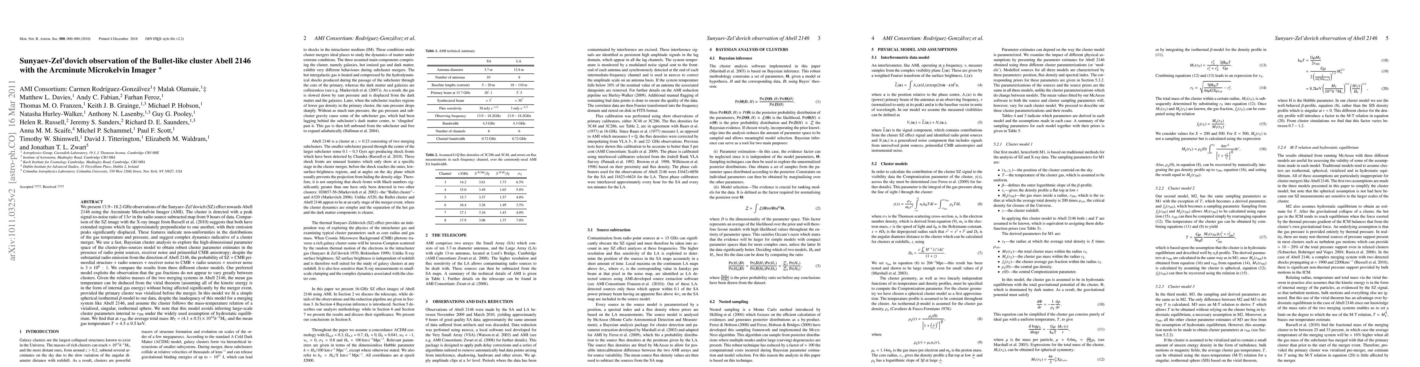 We present 13.9-18.2 GHz observations of the Sunyaev-Zel'dovich (SZ) effect towards Abell 2146 using the Arcminute Microkelvin Imager (AMI). The cluster is detected with a peak SNR ratio of 13 sigma in the radio source subtracted map. Comparison of the SZ and X-ray images suggests that they both have extended regions which lie approximately perpendicular to one another, with their emission peaks significantly displaced. These features indicate non-uniformities in the distributions of the gas temperature and pressure, indicative of a cluster merger. We use a Bayesian cluster analysis to explore the high-dimensional parameter space of the cluster-plus-sources model to obtain cluster parameter estimates in the presence of radio point sources, receiver noise and primordial CMB anisotropy; the probability of SZ + CMB primordial structure + radio sources + receiver noise to CMB + radio sources + receiver noise is 3 x 10^{6}:1. We compare the results from three different cluster models. Our preferred model exploits the observation that the gas fractions do not appear to vary greatly between clusters. Given the relative masses of the two merging systems in Abell 2146, the mean gas temperature can be deduced from the virial theorem (assuming all of the kinetic energy is in the form of internal gas energy) without being affected significantly by the merger event, provided the primary cluster was virialized before the merger. In this model we fit a simple spherical isothermal beta-model, despite the inadequacy of this model for a merging system like Abell 2146, and assume the cluster follows the mass-temperature relation of a virialized, singular, isothermal sphere. We note that this model avoids inferring large-scale cluster parameters internal to r_200 under the widely used assumption of hydrostatic equilibrium. We find that at r_200 M_T= 4.1 \pm 0.5 x 10^{14} h^{-1}M_sun and T=4.5 \pm 0.5 keV.
