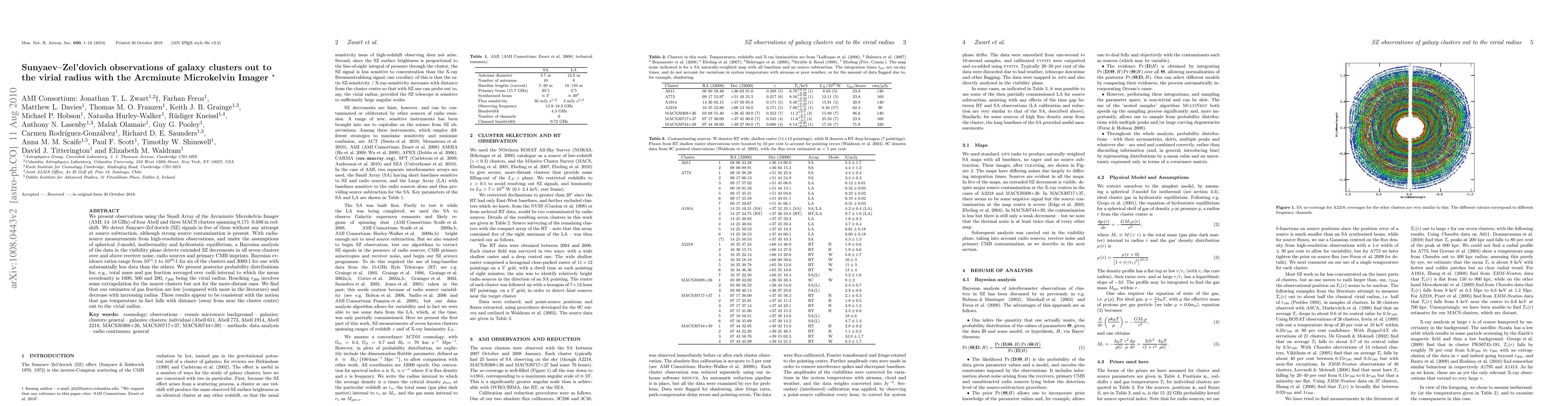 We present observations using the Small Array of the Arcminute Microkelvin Imager (AMI; 14-18 GHz) of four Abell and three MACS clusters spanning 0.171-0.686 in redshift. We detect Sunyaev-Zel'dovich (SZ) signals in five of these without any attempt at source subtraction, although strong source contamination is present. With radio-source measurements from high-resolution observations, and under the assumptions of spherical $\beta$-model, isothermality and hydrostatic equilibrium, a Bayesian analysis of the data in the visibility plane detects extended SZ decrements in all seven clusters over and above receiver noise, radio sources and primary CMB imprints. Bayesian evidence ratios range from 10^{11}:1 to 10^{43}:1 for six of the clusters and 3000:1 for one with substantially less data than the others. We present posterior probability distributions for, e.g., total mass and gas fraction averaged over radii internal to which the mean overdensity is 1000, 500 and 200, r_200 being the virial radius. Reaching r_200 involves some extrapolation for the nearer clusters but not for the more-distant ones. We find that our estimates of gas fraction are low (compared with most in the literature) and decrease with increasing radius. These results appear to be consistent with the notion that gas temperature in fact falls with distance (away from near the cluster centre) out to the virial radius.