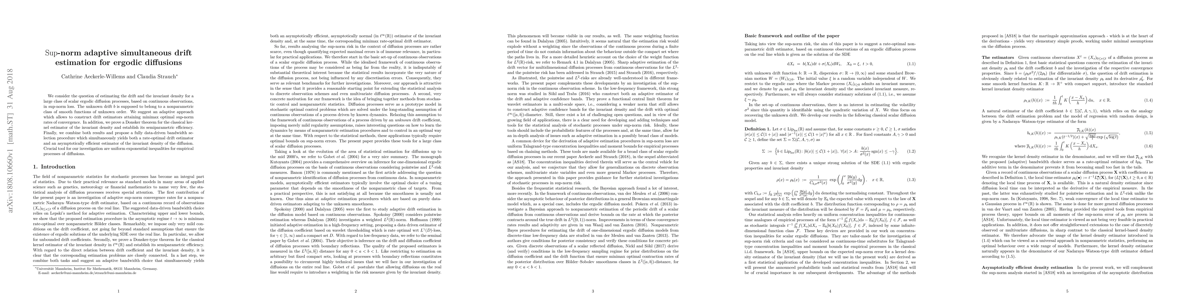We consider the question of estimating the drift and the invariant density for a large class of scalar ergodic diffusion processes, based on continuous observations, in $\sup$-norm loss. The unknown drift $b$ is supposed to belong to a nonparametric class of smooth functions of unknown order. We suggest an adaptive approach which allows to construct drift estimators attaining minimax optimal $\sup$-norm rates of convergence. In addition, we prove a Donsker theorem for the classical kernel estimator of the invariant density and establish its semiparametric efficiency. Finally, we combine both results and propose a fully data-driven bandwidth selection procedure which simultaneously yields both a rate-optimal drift estimator and an asymptotically efficient estimator of the invariant density of the diffusion. Crucial tool for our investigation are uniform exponential inequalities for empirical processes of diffusions.