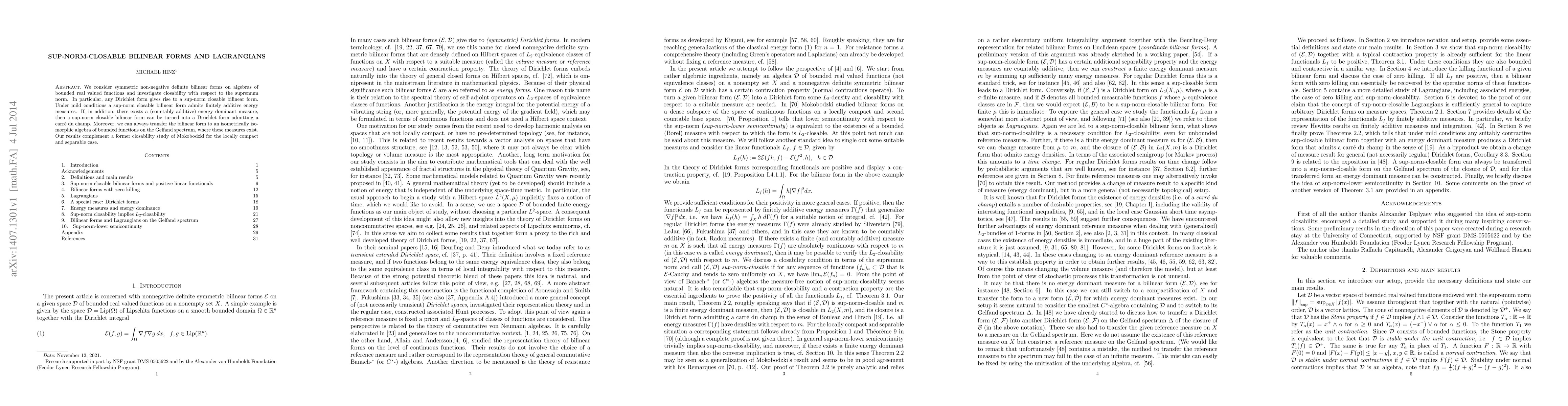 We consider symmetric non-negative definite bilinear forms on algebras of bounded real valued functions and investigate closability with respect to the supremum norm. In particular, any Dirichlet form gives rise to a sup-norm closable bilinear form. Under mild conditions a sup-norm closable bilinear form admits finitely additive energy measures. If, in addition, there exists a (countably additive) energy dominant measure, then a sup-norm closable bilinear form can be turned into a Dirichlet form admitting a carr\'e du champ. Moreover, we can always transfer the bilinear form to an isometrically isomorphic algebra of bounded functions on the Gelfand spectrum, where these measures exist. Our results complement a former closability study of Mokobodzki for the locally compact and separable case.