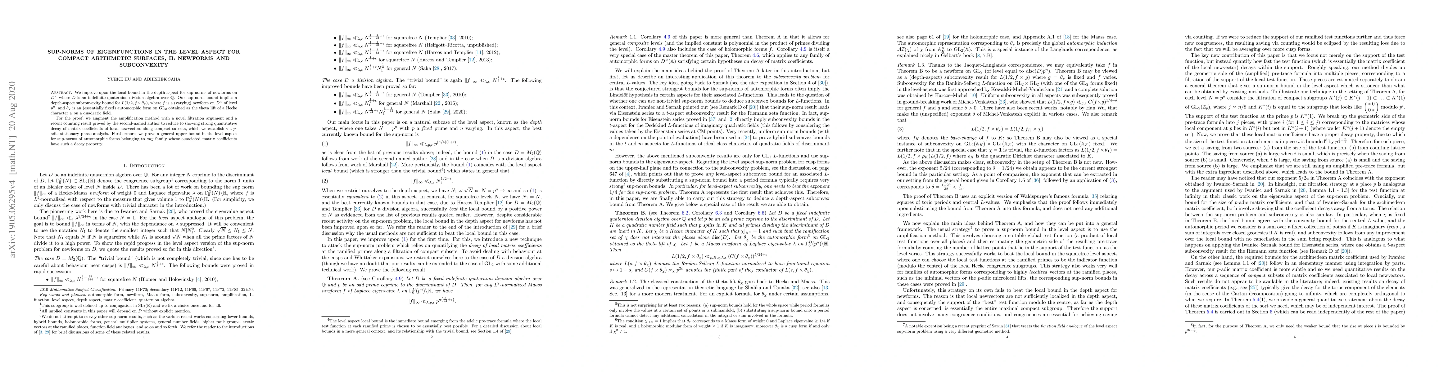 This paper refines local bounds for sup-norms of newforms on compact arithmetic surfaces, achieving subconvexity bounds for $L(1/2, f \times \theta_\chi)$. The proof employs a novel filtration argument and $p$-adic stationary phase analysis, establishing strong decay of matrix coefficients.