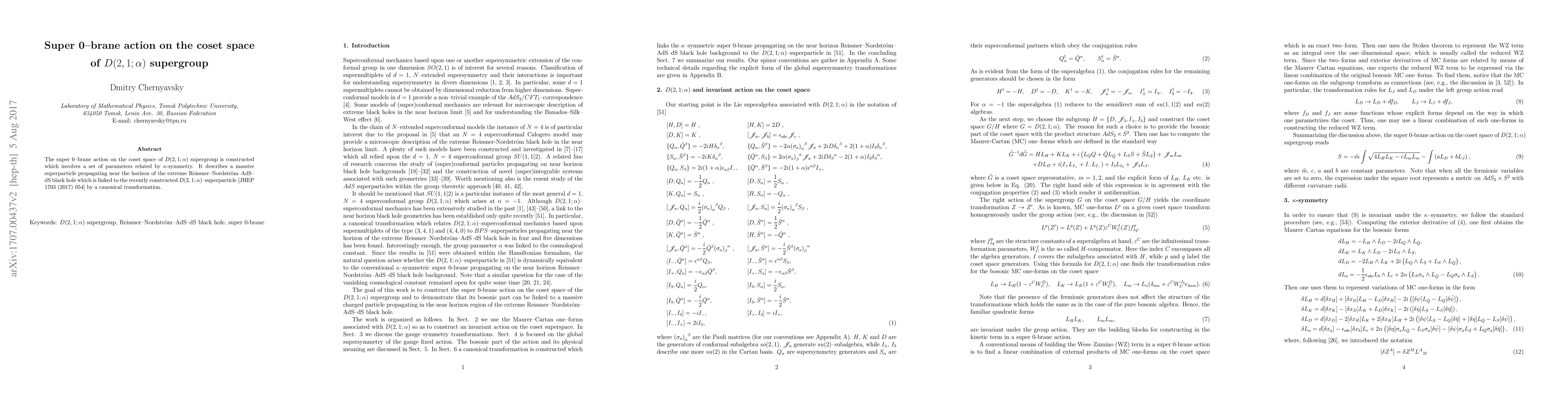 This paper constructs the super 0-brane action on the coset space of the $D(2,1;\alpha)$ supergroup, linking it to a massive superparticle near the horizon of the extreme Reissner-Nordström-AdS-dS black hole via $\kappa$-symmetry, and connects it to the recently constructed $D(2,1;\alpha)$-superparticle through a canonical transformation.