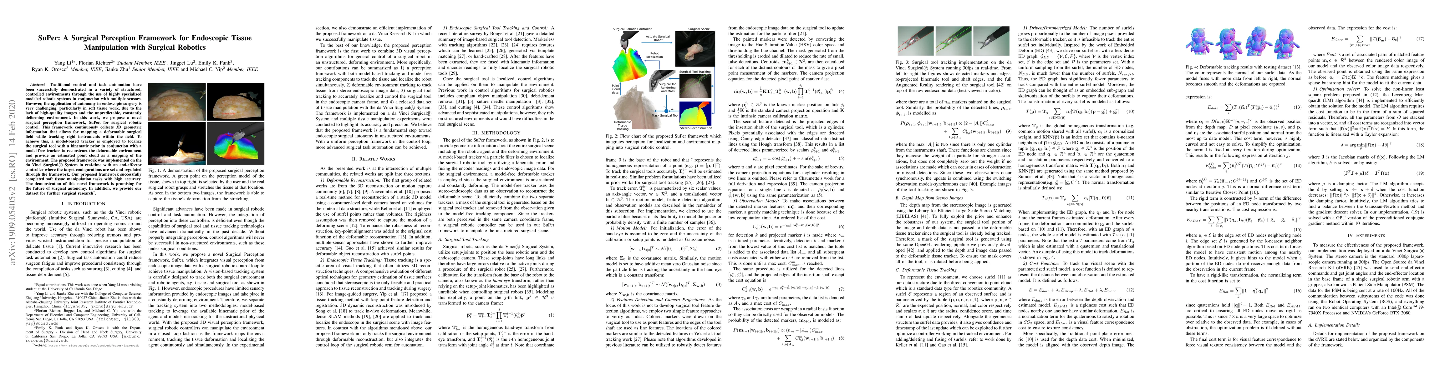 The paper introduces SuPer, a novel surgical perception framework for robotic control in endoscopic surgery, which uses a combination of model-based and model-free tracking to map deformable tissues and localize instruments. The framework was successfully implemented on the da Vinci Surgical System, demonstrating high accuracy in soft tissue manipulation tasks.