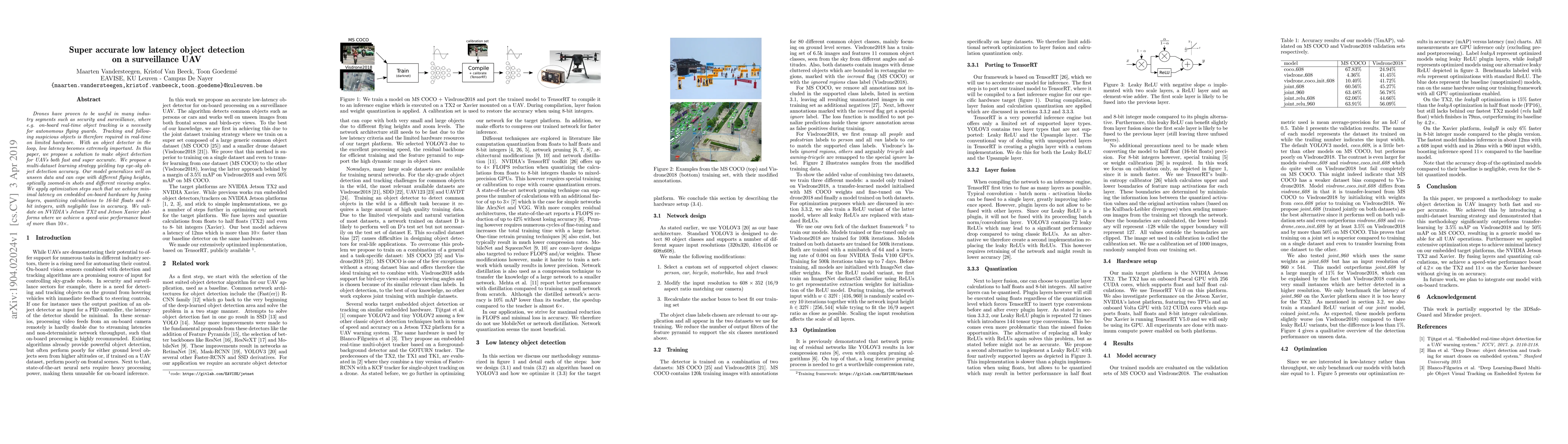 Drones have proven to be useful in many industry segments such as security and surveillance, where e.g. on-board real-time object tracking is a necessity for autonomous flying guards. Tracking and following suspicious objects is therefore required in real-time on limited hardware. With an object detector in the loop, low latency becomes extremely important. In this paper, we propose a solution to make object detection for UAVs both fast and super accurate. We propose a multi-dataset learning strategy yielding top eye-sky object detection accuracy. Our model generalizes well on unseen data and can cope with different flying heights, optically zoomed-in shots and different viewing angles. We apply optimization steps such that we achieve minimal latency on embedded on-board hardware by fusing layers, quantizing calculations to 16-bit floats and 8-bit integers, with negligible loss in accuracy. We validate on NVIDIA's Jetson TX2 and Jetson Xavier platforms where we achieve a speed-wise performance boost of more than 10x.