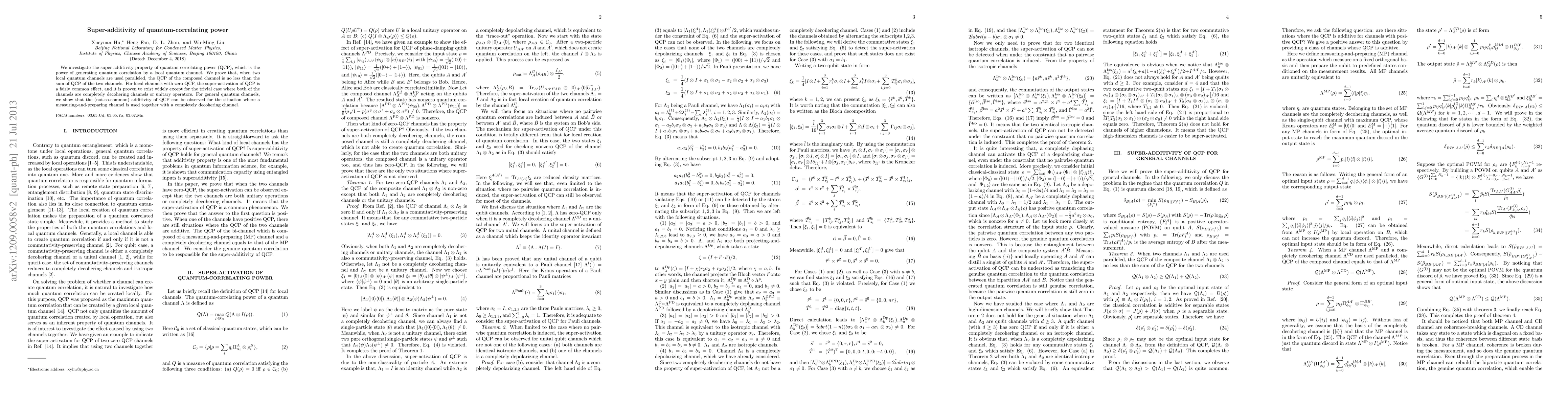 This paper demonstrates that combining two local quantum channels in parallel results in a composed channel whose quantum-correlating power is super-additive, meaning it exceeds the sum of the individual channels' QCP, except in trivial cases. The study also highlights scenarios where additivity of QCP can occur, such as when a measuring-and-preparing channel is paired with a completely decohering channel.