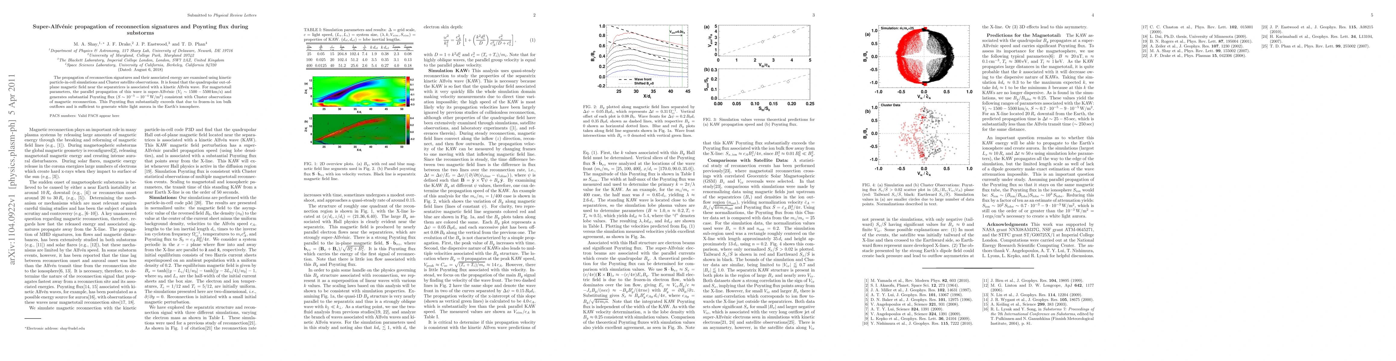 This study investigates the super-Alfv\'enic propagation of reconnection signatures and Poynting flux during substorms using simulations and satellite data. The findings reveal a quadrupolar magnetic field linked to kinetic Alfv\'en waves, which propagate super-Alfv\'enic speeds and generate significant Poynting flux, consistent with auroral observations.