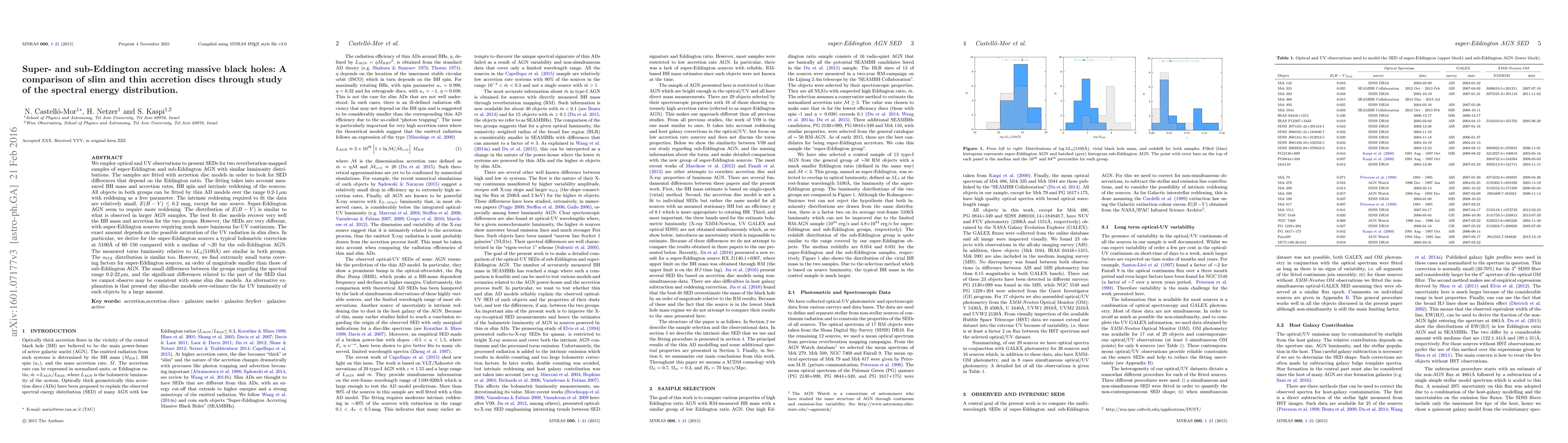 We employ optical and UV observations to present SEDs for two reverberation-mapped samples of super-Eddington and sub-Eddington AGN with similar luminosity distributions. The samples are fitted with accretion disc models in order to look for SED differences that depend on the Eddington ratio. The fitting takes into account measured BH mass and accretion rates, BH spin and intrinsic reddening of the sources. All objects in both groups can be fitted by thin AD models over the range 0.2-1$\,\mu$m with reddening as a free parameter. The intrinsic reddening required to fit the data are relatively small, $E(B-V)\leq0.2$~mag, except for one source. Super-Eddington AGN seem to require more reddening. The distribution of $E(B-V)$ is similar to what is observed in larger AGN samples. The best fit disc models recover very well the BH mass and accretion for the two groups. However, the SEDs are very different, with super-Eddington sources requiring much more luminous far-UV continuum. The exact amount depends on the possible saturation of the UV radiation in slim discs. In particular, we derive for the super-Eddington sources a typical bolometric correction at 5100\AA{} of 60-150 compared with a median of $\sim$20 for the sub-Eddington AGN. The measured torus luminosity relative to $\lambda L_{\lambda}(5100\AA{}$) are similar in both groups. The $\alpha_{OX}$ distribution is similar too. However, we find extremely small torus covering factors for super-Eddington sources, an order of magnitude smaller than those of sub-Eddington AGN. The small differences between the groups regarding the spectral range 0.2-22$\,\mu$m, and the significant differences related to the part of the SED that we cannot observed may be consistent with some slim disc models. An alternative explanation is that present day slim-disc models over-estimate the far UV luminosity of such objects by a large amount.
