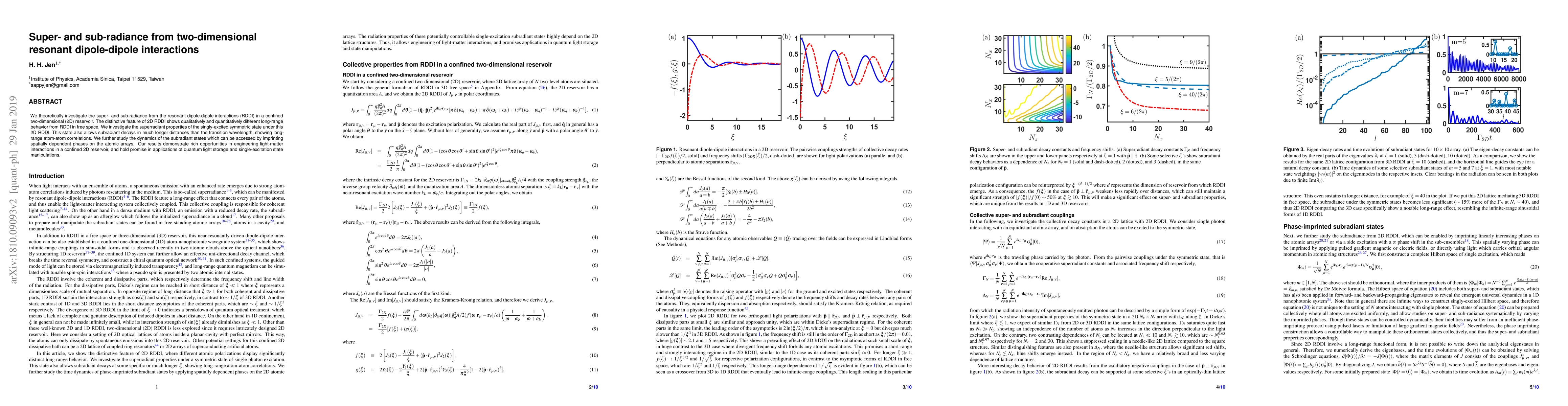 This paper investigates the unique super- and sub-radiance phenomena arising from resonant dipole-dipole interactions in a two-dimensional confined reservoir, revealing distinct long-range behaviors compared to free space. The study highlights the potential for manipulating light-matter interactions and suggests applications in quantum light storage and single-excitation state control.