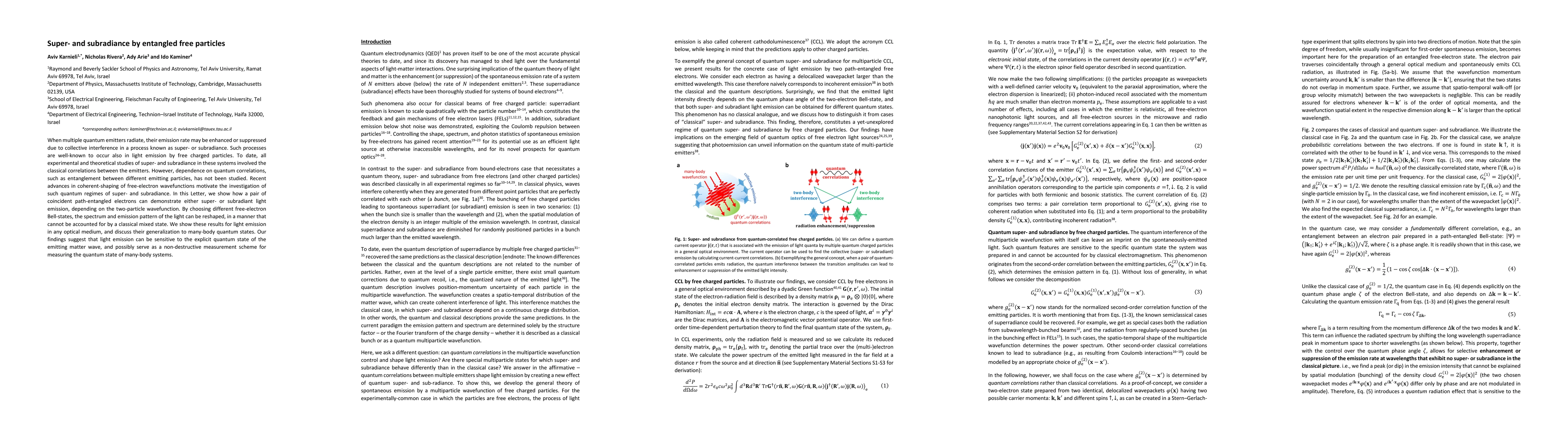 When multiple quantum emitters radiate, their emission rate may be enhanced or suppressed due to collective interference in a process known as super- or subradiance. Such processes are well-known to occur also in light emission by free charged particles. To date, all experimental and theoretical studies of super- and subradiance in these systems involved the classical correlations between the emitters. However, dependence on quantum correlations, such as entanglement between different emitting particles, has not been studied. Recent advances in coherent-shaping of free-electron wavefunctions motivate the investigation of such quantum regimes of super- and subradiance. In this Letter, we show how a pair of coincident path-entangled electrons can demonstrate either super- or subradiant light emission, depending on the two-particle wavefunction. By choosing different free-electron Bell-states, the spectrum and emission pattern of the light can be reshaped, in a manner that cannot be accounted for by a classical mixed state. We show these results for light emission in any optical medium, and discuss their generalization to many-body quantum states. Our findings suggest that light emission can be sensitive to the explicit quantum state of the emitting matter wave, and possibly serve as a non-destructive measurement scheme for measuring the quantum state of many-body systems.