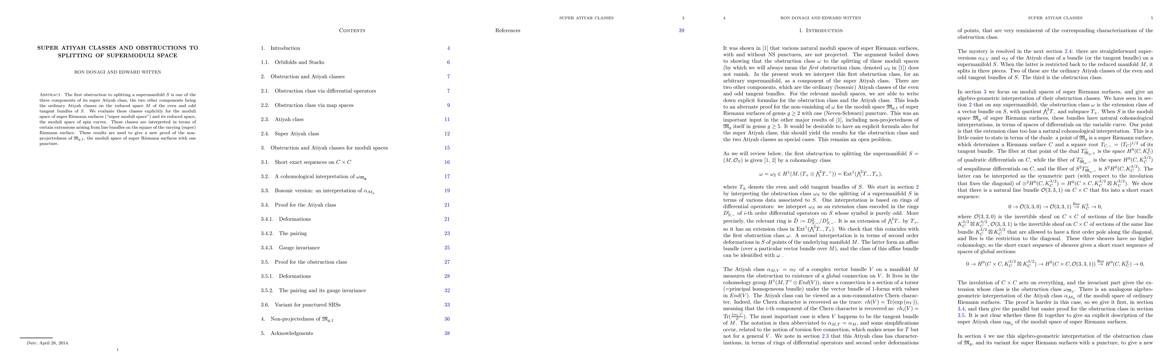 The first obstruction to splitting a supermanifold S is one of the three components of its super Atiyah class, the two other components being the ordinary Atiyah classes on the reduced space M of the even and odd tangent bundles of S. We evaluate these classes explicitly for the moduli space of super Riemann surfaces ("super moduli space") and its reduced space, the moduli space of spin curves. These classes are interpreted in terms of certain extensions arising from line bundles on the square of the varying (super) Riemann surface. These results are used to give a new proof of the non-projectedness of ${\mathfrak{M}}_{g,1}$, the moduli space of super Riemann surfaces with one puncture.