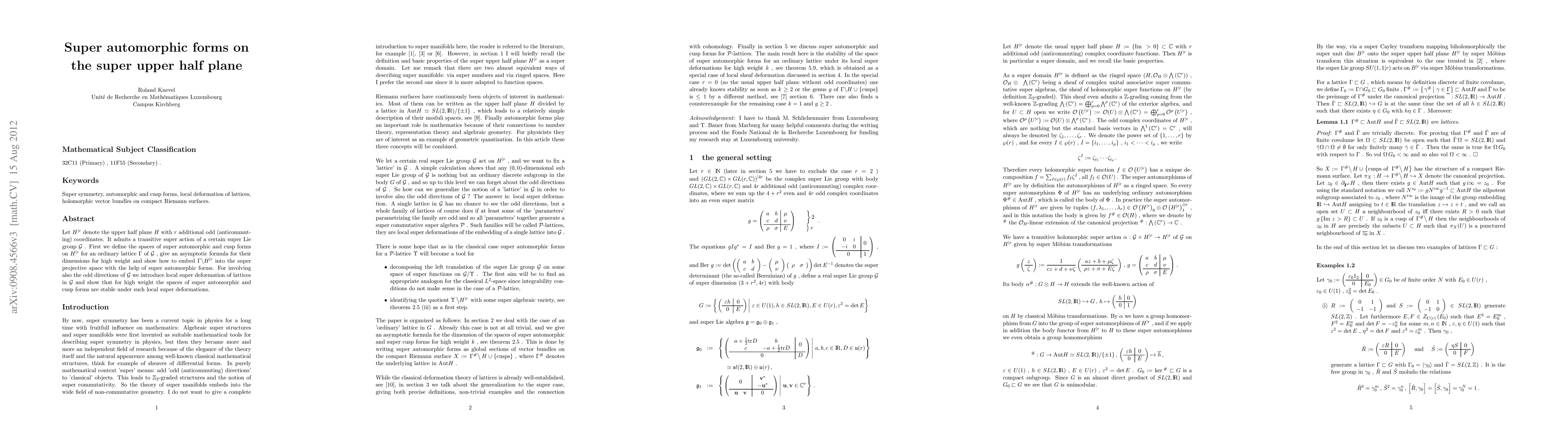 This paper defines super automorphic and cusp forms on the super upper half plane, introducing local super deformations of lattices in a super Lie group G. It provides an asymptotic formula for the dimensions of these spaces for high weight and demonstrates their stability under local super deformations.