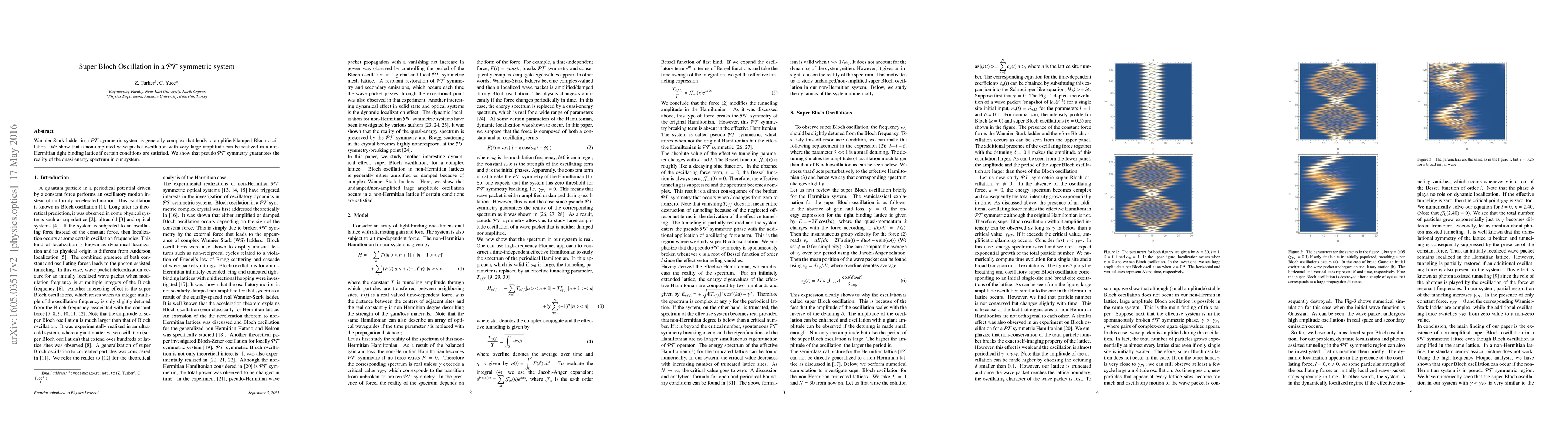 This paper demonstrates that in a PT symmetric system, a non-amplified wave packet can exhibit super Bloch oscillation with large amplitude under certain conditions. Pseudo PT symmetry ensures the reality of the quasi-energy spectrum, enabling this unique oscillation behavior.