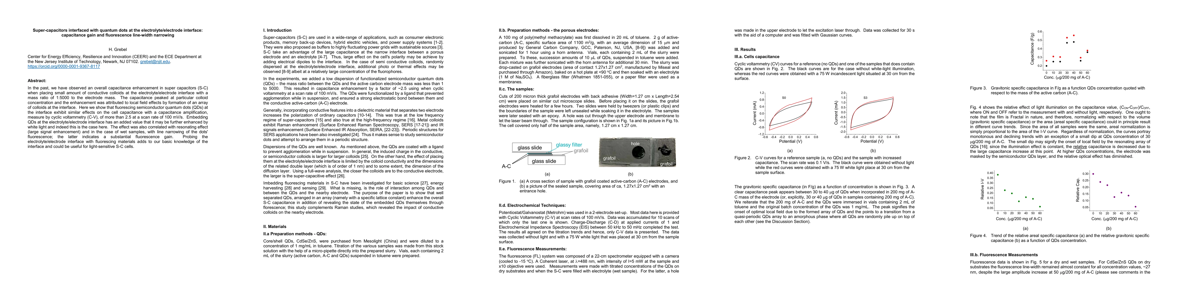The paper demonstrates that embedding fluorescing quantum dots at the electrolyte/electrode interface in supercapacitors can lead to capacitance amplification and fluorescence line-width narrowing, offering insights into interface dynamics.