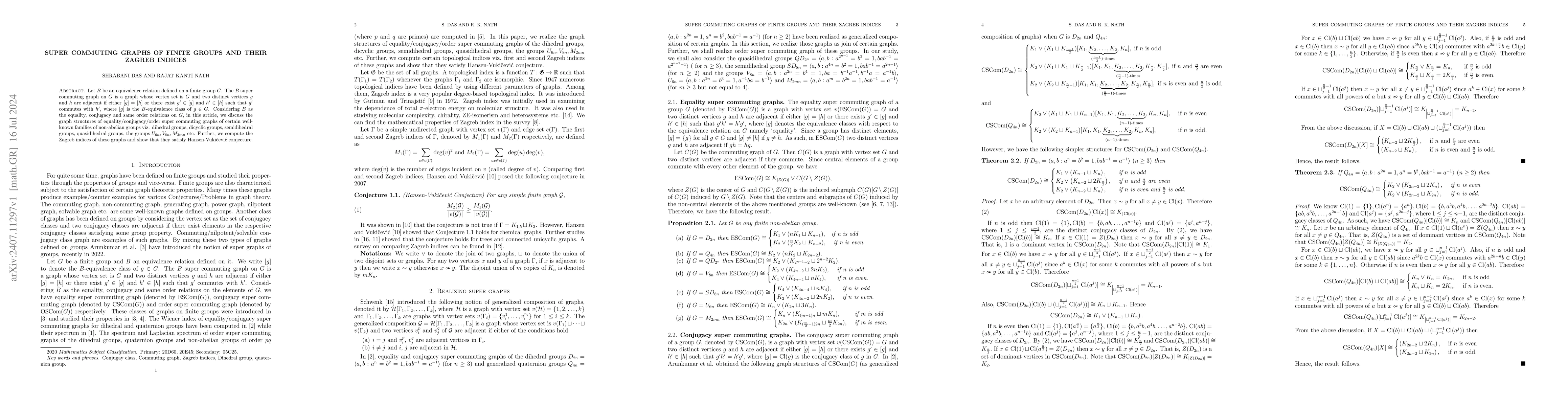 This paper explores the super commuting graphs of finite groups based on equality, conjugacy, and same order relations, focusing on non-abelian groups like dihedral and semidihedral groups. It computes the Zagreb indices for these graphs and demonstrates their compliance with the Hansen-Vukićević conjecture.