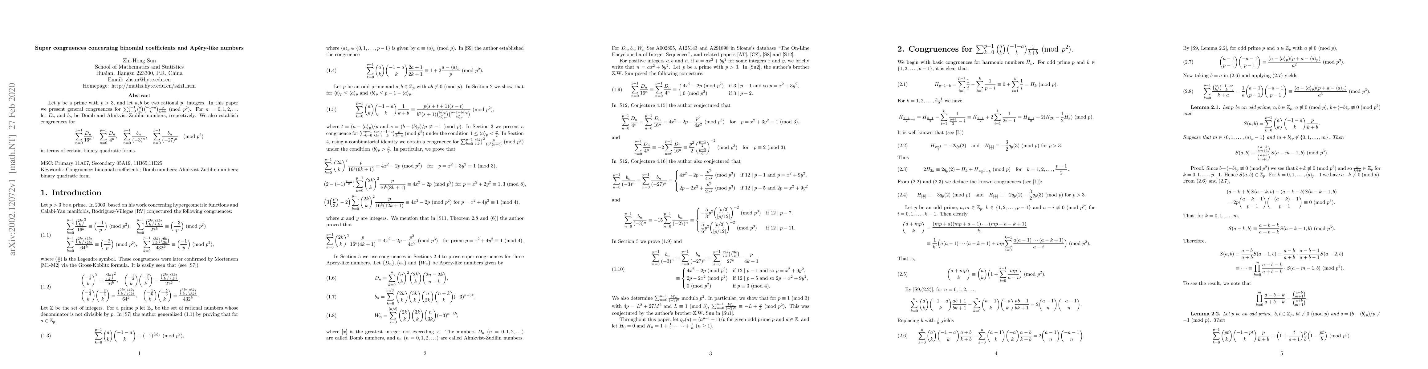 This paper presents general congruences for sums involving binomial coefficients and $p$-integers modulo $p^2$, where $p$ is a prime greater than 3. It also establishes congruences for sums of Domb and Almkvist-Zudilin numbers modulo $p^2$, linked to specific binary quadratic forms.