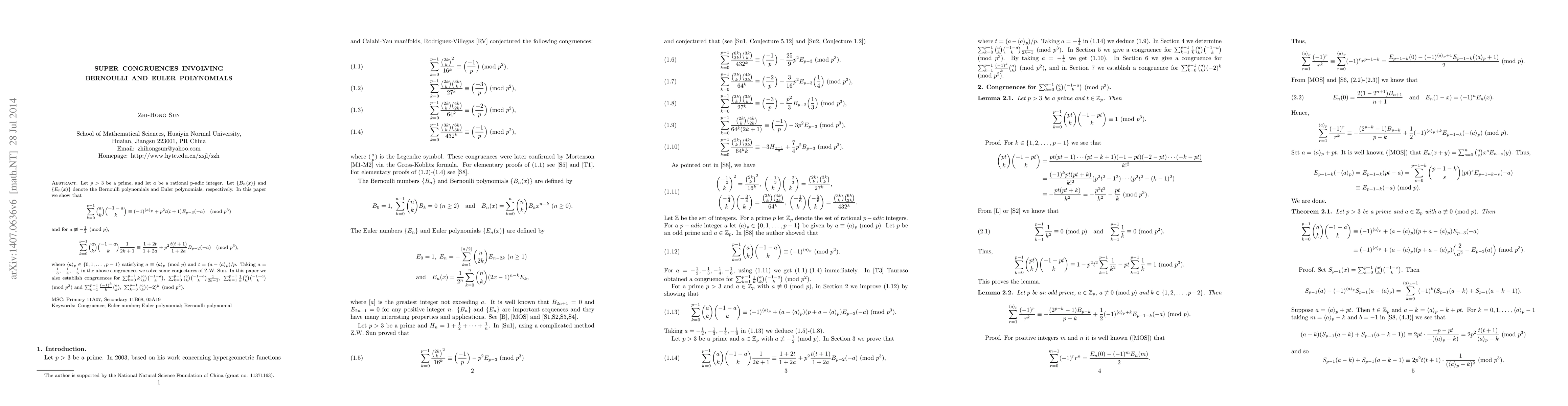 Let $p>3$ be a prime, and let $a$ be a rational p-adic integer. Let $\{B_n(x)\}$ and $\{E_n(x)\}$ denote the Bernoulli polynomials and Euler polynomials, respectively. In this paper we show that $$\sum_{k=0}^{p-1}\binom ak\binom{-1-a}k\equiv (-1)^{\langle a\rangle_p}+ p^2t(t+1)E_{p-3}(-a)\pmod{p^3}$$ and for $a\not\equiv -\frac 12\pmod p$, $$\sum_{k=0}^{p-1}\binom ak\binom{-1-a}k\frac 1{2k+1}\equiv \frac{1+2t}{1+2a} +p^2\frac{t(t+1)}{1+2a}B_{p-2}(-a)\pmod{p^3},$$ where $\langle a\rangle_p\in\{0,1,\ldots,p-1\}$ satisfying $a\equiv \langle a\rangle_p\pmod p$ and $t=(a-\langle a\rangle_p)/p$. Taking $a=-\frac 13,-\frac 14,-\frac 16$ in the above congruences we solve some conjectures of Z.W. Sun. In this paper we also establish congruences for $\sum_{k=0}^{p-1}k\binom ak\binom{-1-a}k,\ \sum_{k=0}^{p-1}\binom ak\binom{-1-a}k\frac 1{2k-1},\ \sum_{k=1}^{p-1}\frac 1k\binom ak\binom{-1-a}k\pmod{p^3}$ and $\sum_{k=1}^{p-1}\frac {(-1)^k}k\binom ak,\ \sum_{k=0}^{p-1}\binom ak(-2)^k\pmod{p^2}.$