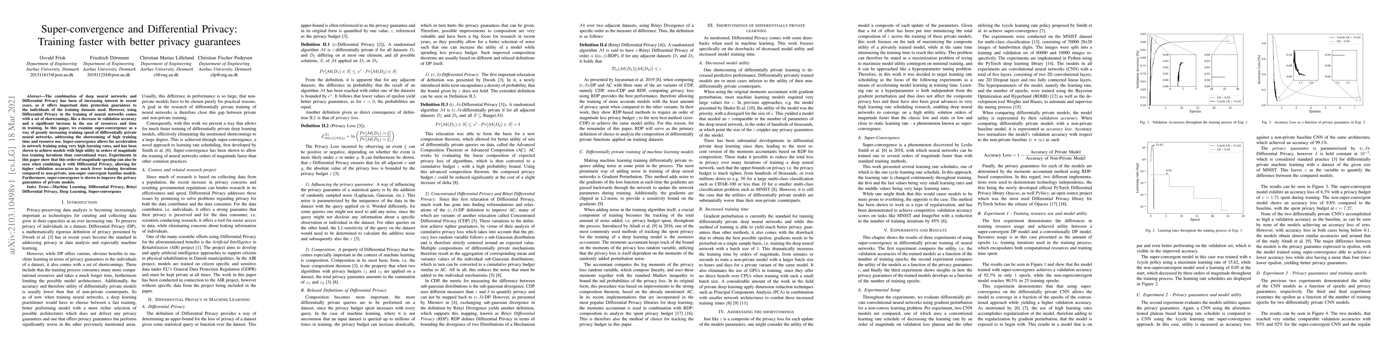The combination of deep neural networks and Differential Privacy has been of increasing interest in recent years, as it offers important data protection guarantees to the individuals of the training datasets used. However, using Differential Privacy in the training of neural networks comes with a set of shortcomings, like a decrease in validation accuracy and a significant increase in the use of resources and time in training. In this paper, we examine super-convergence as a way of greatly increasing training speed of differentially private neural networks, addressing the shortcoming of high training time and resource use. Super-convergence allows for acceleration in network training using very high learning rates, and has been shown to achieve models with high utility in orders of magnitude less training iterations than conventional ways. Experiments in this paper show that this order-of-magnitude speedup can also be seen when combining it with Differential Privacy, allowing for higher validation accuracies in much fewer training iterations compared to non-private, non-super convergent baseline models. Furthermore, super-convergence is shown to improve the privacy guarantees of private models.