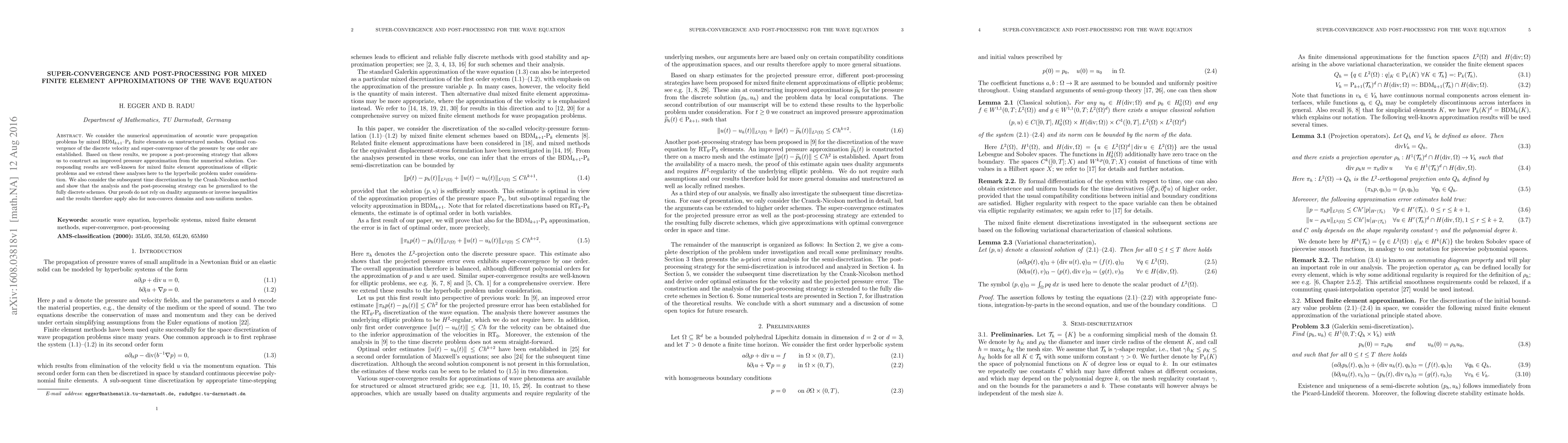 We consider the numerical approximation of acoustic wave propagation problems by mixed BDM(k+1)-P(k) finite elements on unstructured meshes. Optimal convergence of the discrete velocity and super-convergence of the pressure by one order are established. Based on these results, we propose a post-processing strategy that allows us to construct an improved pressure approximation from the numerical solution. Corresponding results are well-known for mixed finite element approximations of elliptic problems and we extend these analyses here to the hyperbolic problem under consideration. We also consider the subsequent time discretization by the Crank-Nicolson method and show that the analysis and the post-processing strategy can be generalized to the fully discrete schemes. Our proofs do not rely on duality arguments or inverse inequalities and the results therefore apply also for non-convex domains and non-uniform meshes.