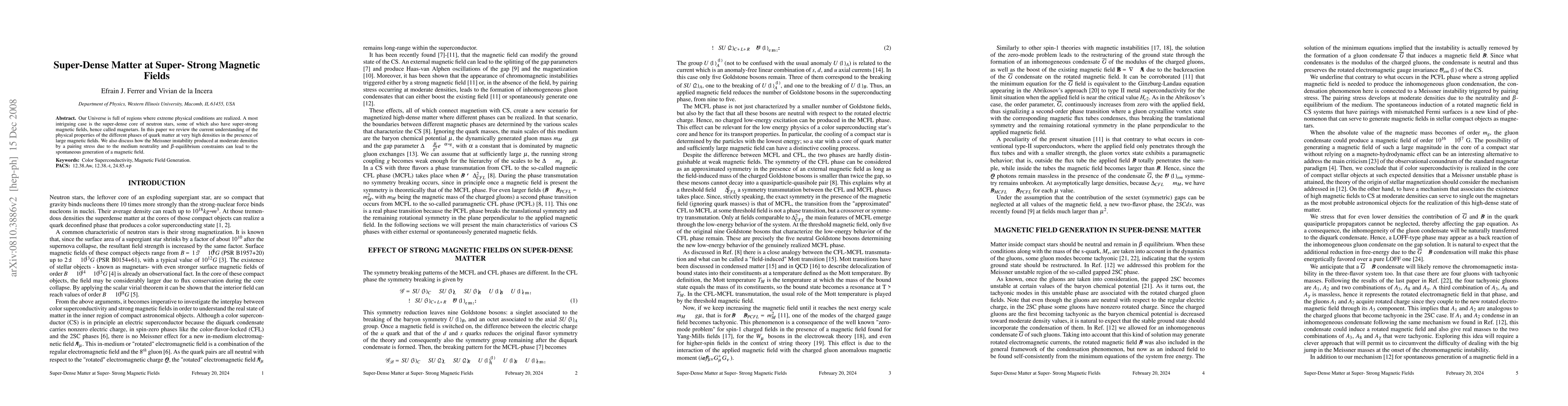 Our Universe is full of regions where extreme physical conditions are realized. A most intriguing case is the super-dense core of neutron stars, some of which also have super-strong magnetic fields, hence called magnetars. In this paper we review the current understanding of the physical properties of the different phases of quark matter at very high densities in the presence of large magnetic fields. We also discuss how the Meissner instability produced at moderate densities by a pairing stress due to the medium neutrality and $\beta$-equilibrium constraints can lead to the spontaneous generation of a magnetic field.