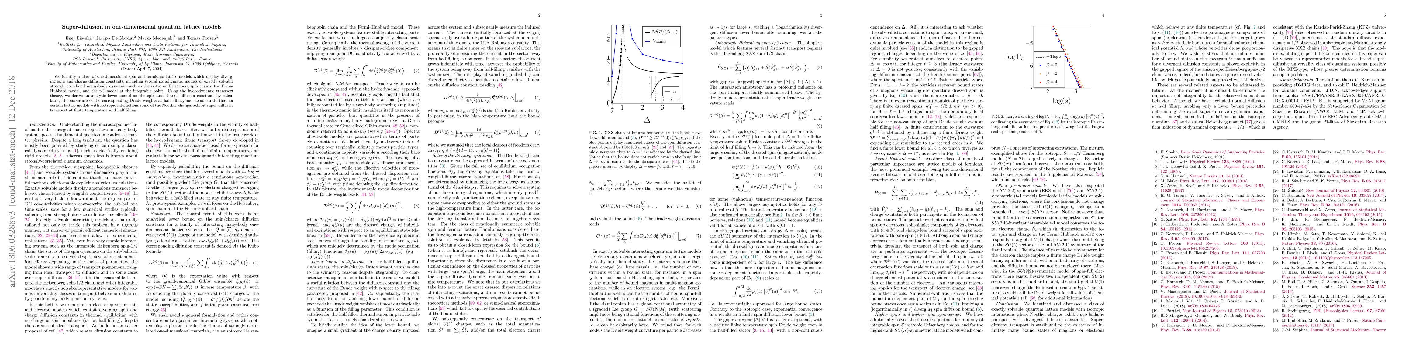 This paper identifies a class of one-dimensional quantum lattice models, including the Heisenberg spin chains and Fermi-Hubbard model, that exhibit super-diffusion. Using hydrodynamic transport theory, it derives an analytic lower bound for the spin and charge diffusion constants, showing that certain isotropic models exhibit super-diffusive transport at finite temperature and half filling.