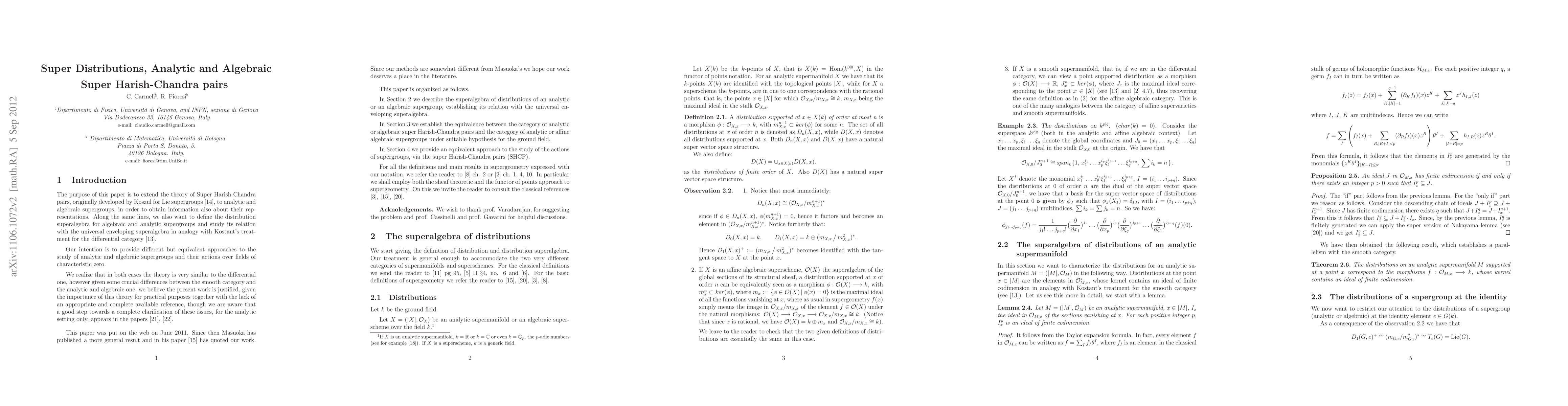 This paper extends the concept of Super Harish-Chandra pairs to analytic and algebraic supergroups, aiming to enhance understanding of their representations. It also introduces the distribution superalgebra for these supergroups and explores its connection with the universal enveloping superalgebra.