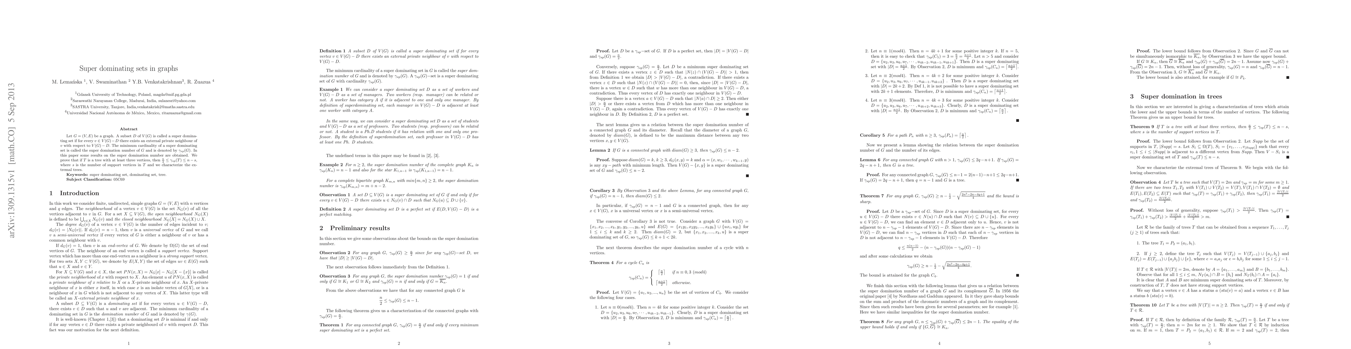 The paper investigates super dominating sets in graphs, defining them and exploring their properties through theoretical proofs and examples.