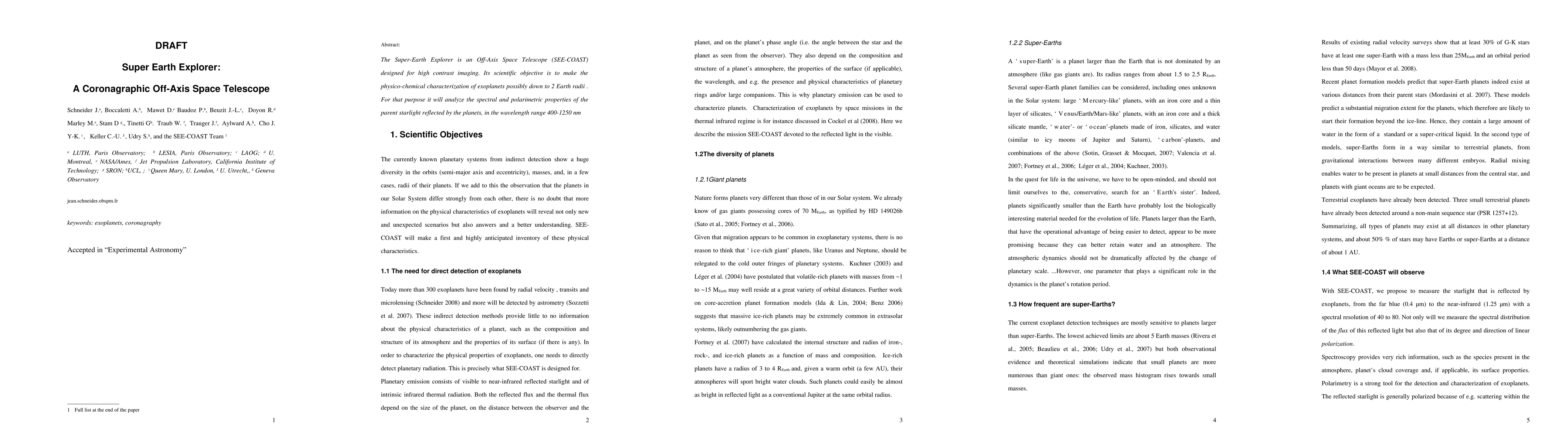 The Super-Earth Explorer (SEE-COAST) is an off-axis space telescope aimed at high contrast imaging to characterize exoplanets up to 2 Earth radii. It will analyze reflected starlight in the 400-1250 nm range for spectral and polarimetric properties.