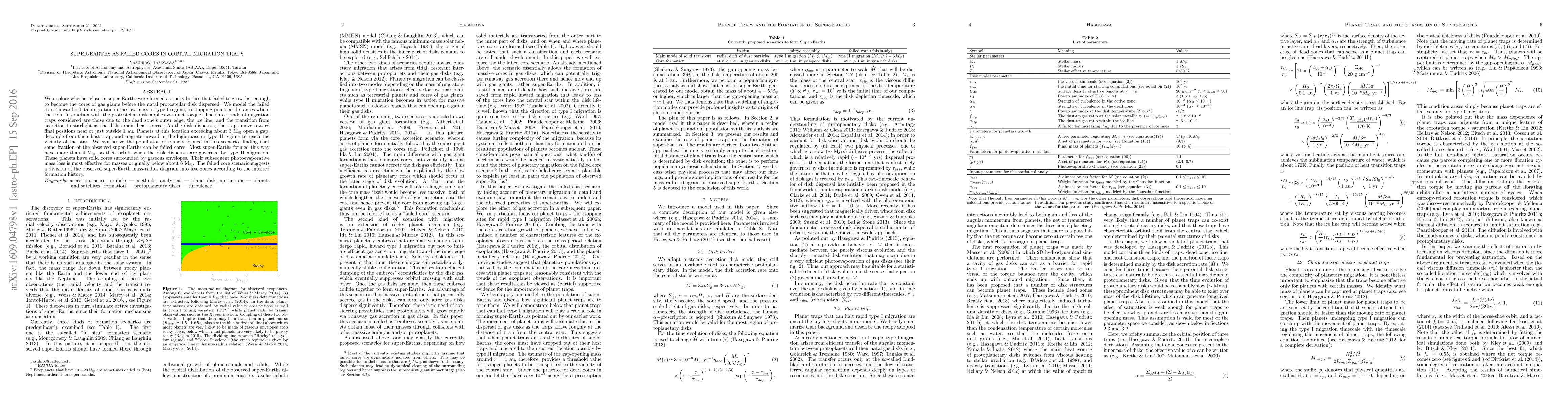 We explore whether close-in super-Earths were formed as rocky bodies that failed to grow fast enough to become the cores of gas giants before the natal protostellar disk dispersed. We model the failed cores' inward orbital migration in the low-mass or type I regime, to stopping points at distances where the tidal interaction with the protostellar disk applies zero net torque. The three kinds of migration traps considered are those due to the dead zone's outer edge, the ice line, and the transition from accretion to starlight as the disk's main heat source. As the disk disperses, the traps move toward final positions near or just outside 1~au. Planets at this location exceeding about 3~M$_\oplus$ open a gap, decouple from their host trap, and migrate inward in the high-mass or type II regime to reach the vicinity of the star. We synthesize the population of planets formed in this scenario, finding that some fraction of the observed super-Earths can be failed cores. Most super-Earths formed this way have more than 4~M$_\oplus$, so their orbits when the disk disperses are governed by type II migration. These planets have solid cores surrounded by gaseous envelopes. Their subsequent photoevaporative mass loss is most effective for masses originally below about 6 M$_\oplus$. The failed core scenario suggests a division of the observed super-Earth mass-radius diagram into five zones according to the inferred formation history.