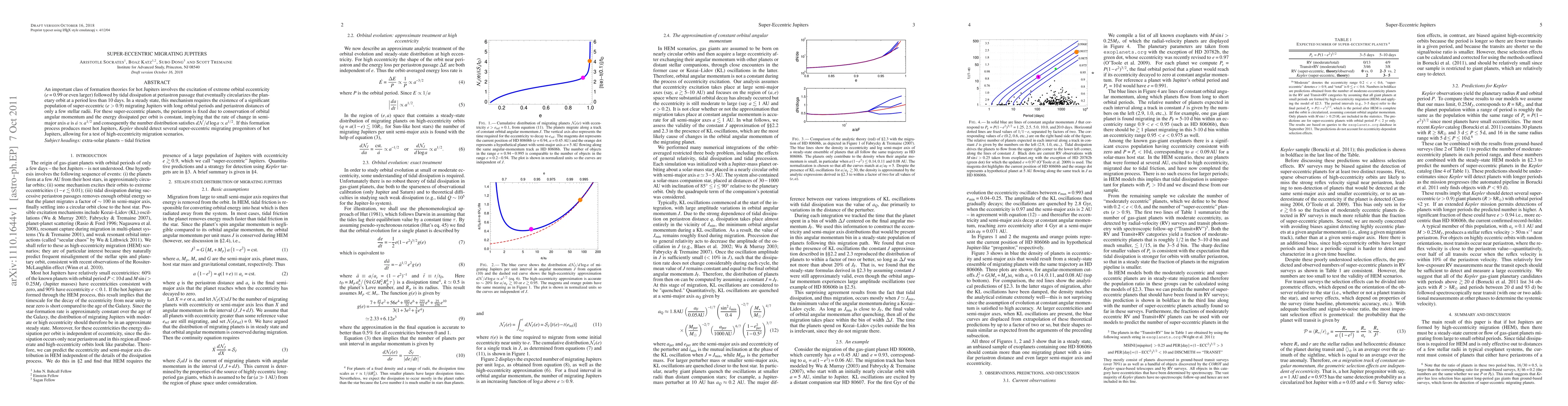 This paper discusses the formation theories of hot Jupiters through the excitation of extreme orbital eccentricities, proposing the existence of a significant population of super-eccentric migrating Jupiters. It suggests that the detection of these super-eccentric planets by Kepler could validate high-eccentricity migration models.