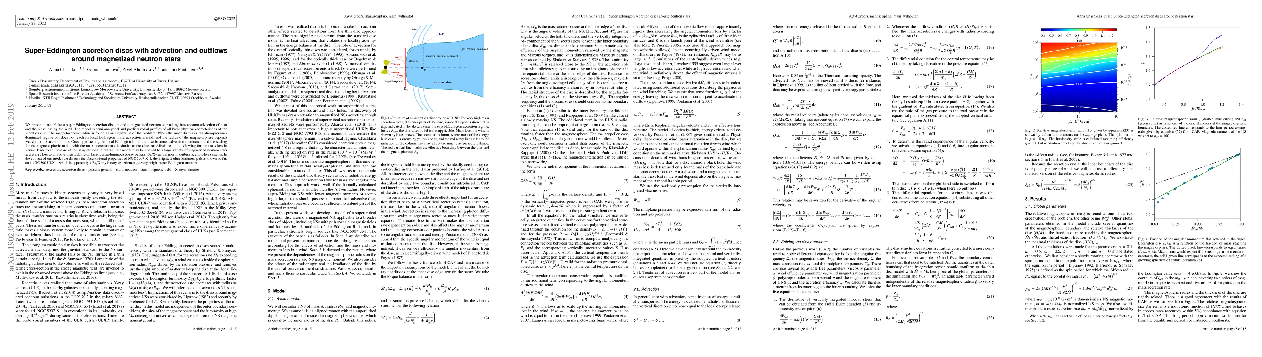 The research presents a semi-analytical model for super-Eddington accretion discs around magnetized neutron stars, incorporating advection and mass loss via wind. It predicts radial profiles of all basic physical characteristics of the accretion disc.
