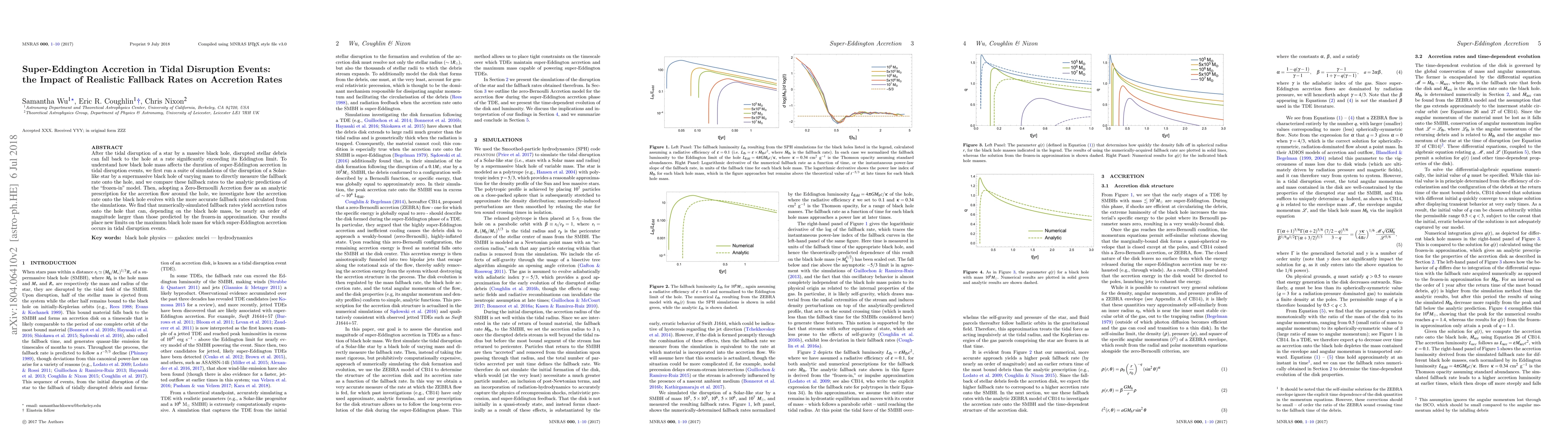 After the tidal disruption of a star by a massive black hole, disrupted stellar debris can fall back to the hole at a rate significantly exceeding its Eddington limit. To understand how black hole mass affects the duration of super-Eddington accretion in tidal disruption events, we first run a suite of simulations of the disruption of a Solar-like star by a supermassive black hole of varying mass to directly measure the fallback rate onto the hole, and we compare these fallback rates to the analytic predictions of the "frozen-in" model. Then, adopting a Zero-Bernoulli Accretion flow as an analytic prescription for the accretion flow around the hole, we investigate how the accretion rate onto the black hole evolves with the more accurate fallback rates calculated from the simulations. We find that numerically-simulated fallback rates yield accretion rates onto the hole that can, depending on the black hole mass, be nearly an order of magnitude larger than those predicted by the frozen-in approximation. Our results place new limits on the maximum black hole mass for which super-Eddington accretion occurs in tidal disruption events.