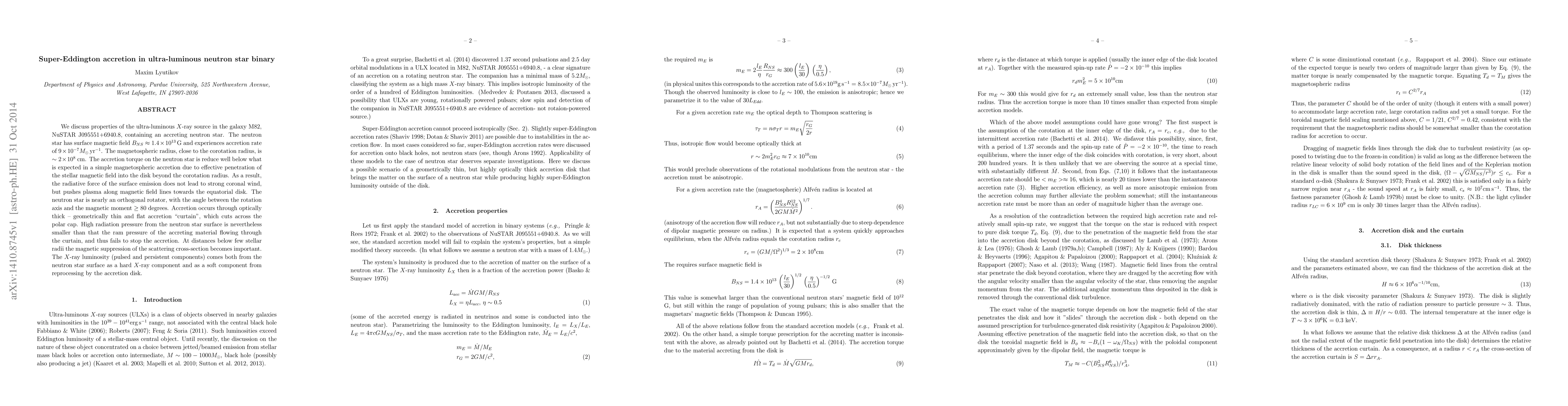 We discuss properties of the ultra-luminous $X$-ray source in the galaxy M82, NuSTAR J095551+6940.8, containing an accreting neutron star. The neutron star has surface magnetic field $ B_{NS} \approx 1.4 \times 10^{13 } \, {\rm G}$ and experiences accretion rate of $9 \times 10^{-7} M_\odot {\rm \, yr}^{-1} $. The magnetospheric radius, close to the corotation radius, is $\sim 2 \times 10^8$ cm. The accretion torque on the neutron star is reduce well below what is expected in a simple magnetospheric accretion due to effective penetration of the stellar magnetic field into the disk beyond the corotation radius. As a result, the radiative force of the surface emission does not lead to strong coronal wind, but pushes plasma along magnetic field lines towards the equatorial disk. The neutron star is nearly an orthogonal rotator, with the angle between the rotation axis and the magnetic moment $\geq 80$ degrees. Accretion occurs through optically thick -- geometrically thin and flat accretion "curtain", which cuts across the polar cap. High radiation pressure from the neutron star surface is nevertheless smaller than that the ram pressure of the accreting material flowing through the curtain, and thus fails to stop the accretion. At distances below few stellar radii the magnetic suppression of the scattering cross-section becomes important. The $X$-ray luminosity (pulsed and persistent components) comes both from the neutron star surface as a hard $X$-ray component and as a soft component from reprocessing by the accretion disk.